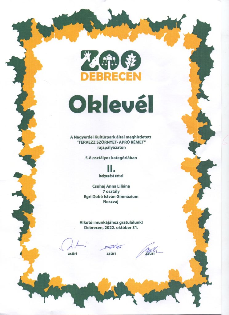A 2022. október 31-i díjátadón, Csuhaj Anna Liliána (7.a) munkáját is díjazták, a korcsoportjában II. helyezést ért el.