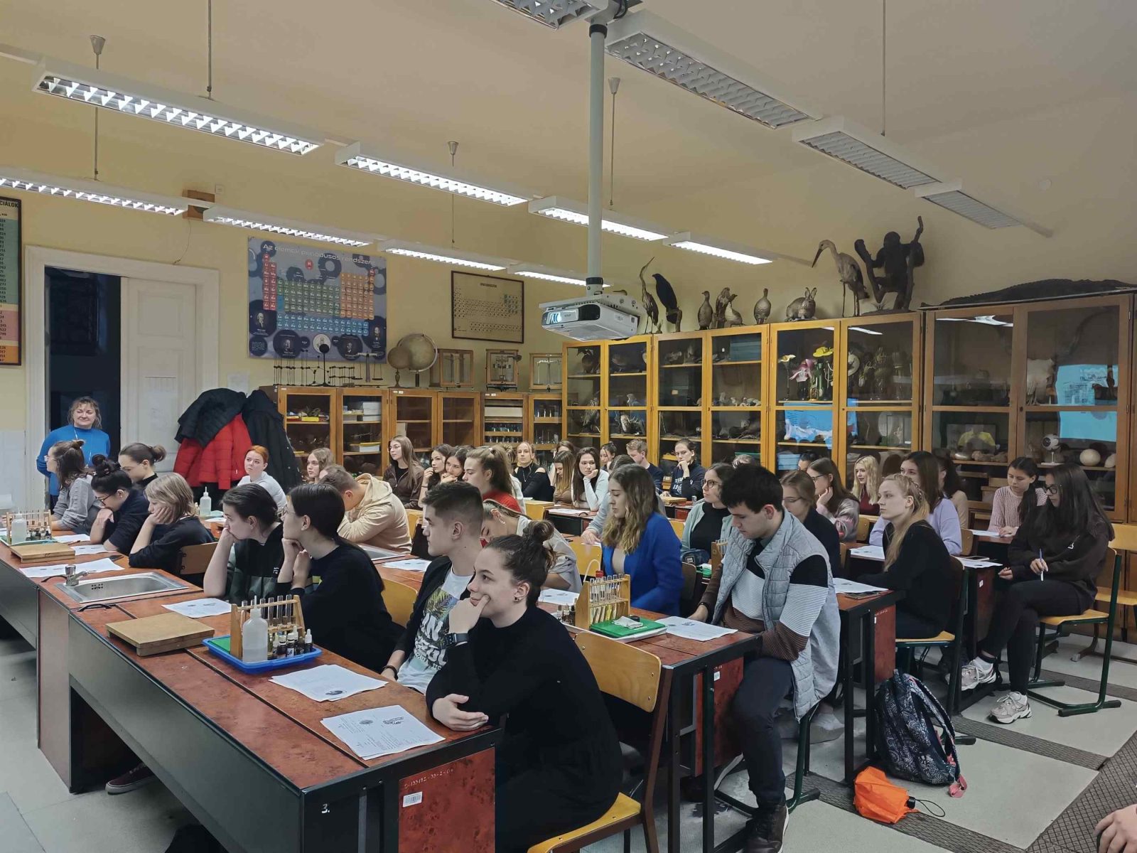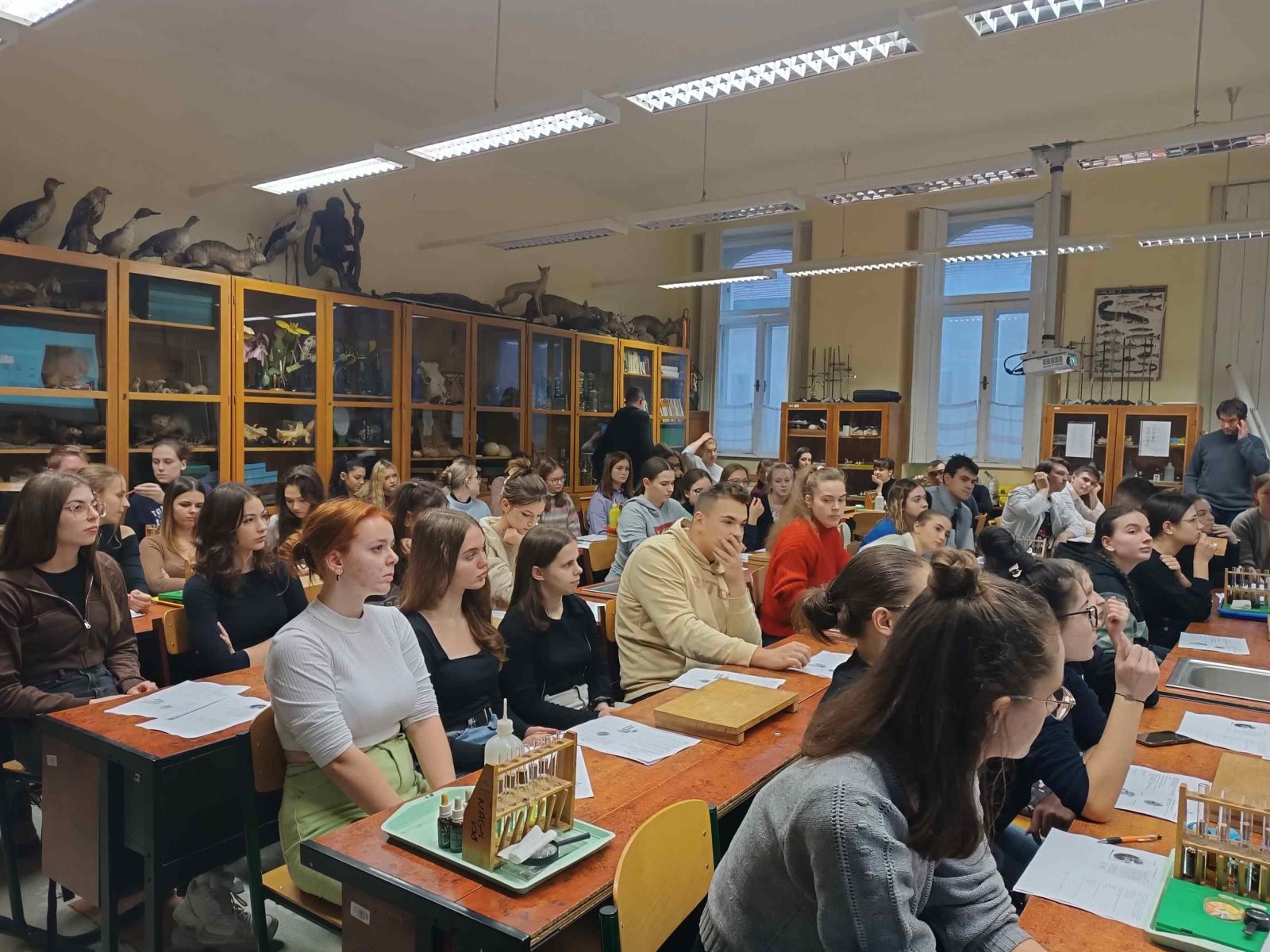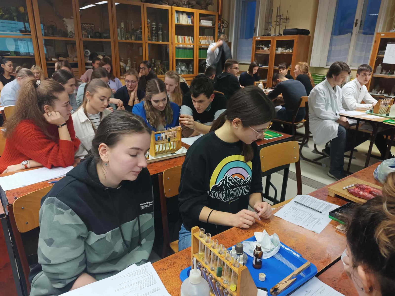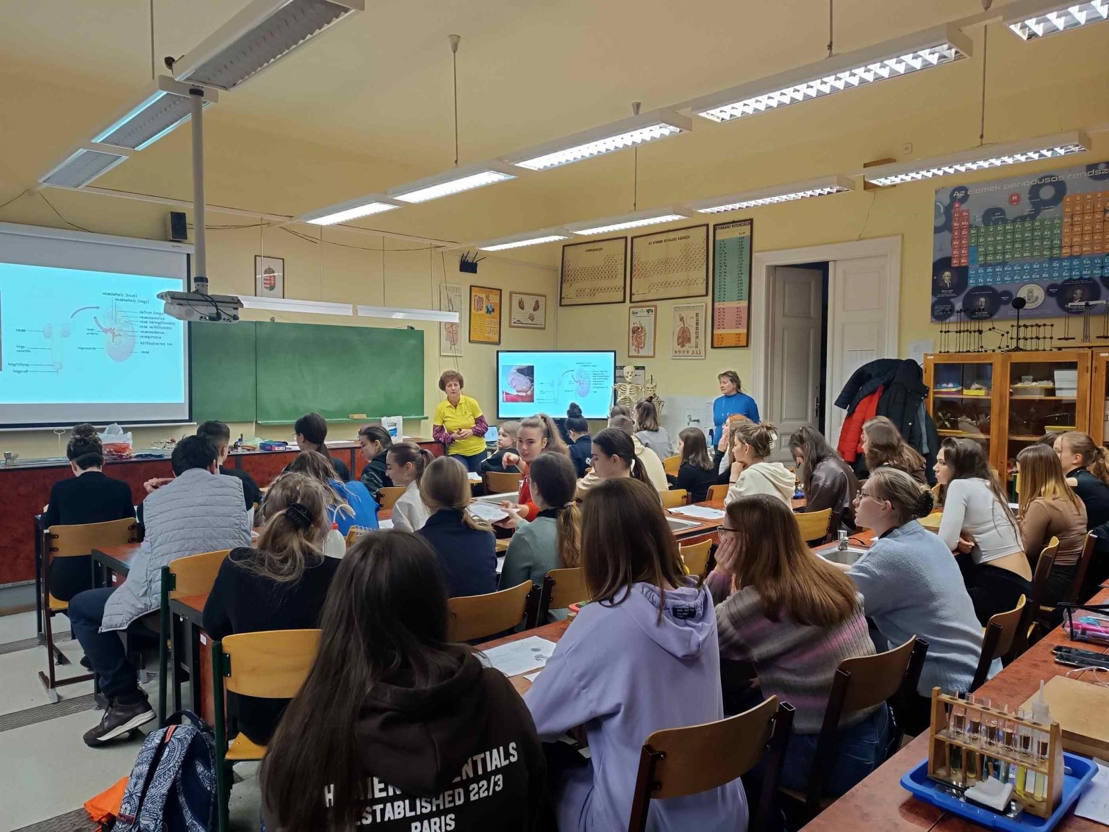 Nagy érdeklődés követte a Nemzeti Tudósképző Akadémia idei utolsó, december 9-ei foglalkozását, amelynek témája az ember kiválasztó szervrendszerének megismerése volt. A kiválasztó működés anatómiai felépítésének és működésének ismétlése után sertésvesét boncoltunk. A külső jegyek, belső szerkezet tanulmányozása után a vesetestecskék működése, a szűrlet képződése és a vizelet összetételének megbeszélésére került sor. A tanulók kémiai kísérletekkel egészséges és kóros vizeletben előforduló ionokat, vegyületeket mutattak ki (pl. klorid-ion, foszfát-ion, cukor, fehérje), miközben megbeszéltük, hogy milyen anyagok jelenléte, milyen betegségre utalhat. Végül egy versenyre került sor. A csoportok hat ismeretlen vizeletmintát (sárgára festett oldatot) kaptak és meg kellett határozniuk, hogy melyik lehet desztillált víz, sós víz, normál vizelet, éhező vizelet, hólyaghurutos és gyulladásos vizelet, cukorbeteg vizelet. A legügyesebb csoportok jutalmat kaptak.