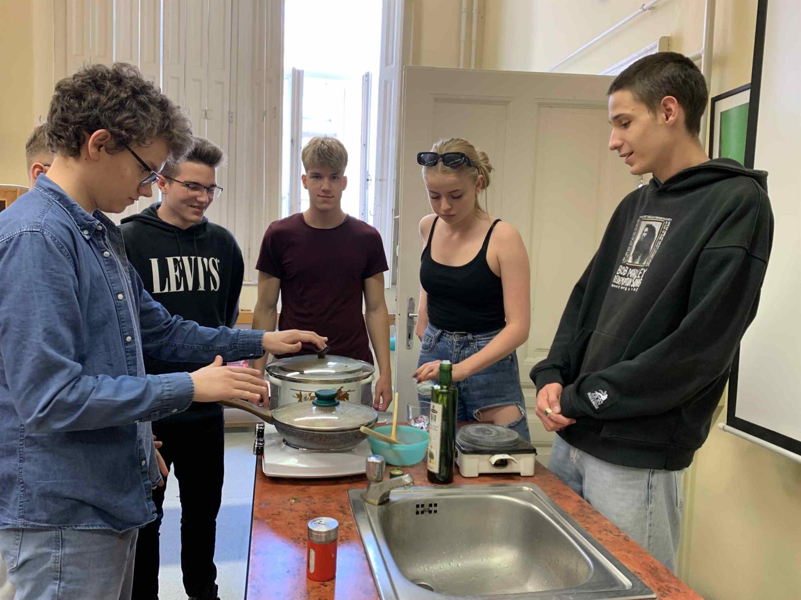 A fenti címmel került megrendezésre a 11. D osztály biológia tagozatosainak részvételével az egészséges táplálkozásról szóló projekt.  Ennek keretein belül a diákok 5 különböző csoportot alakítottak ki, mindegyiküknek más volt a feladata. Az egyik csoport különböző élelmiszerek tápanyagösszetételét vizsgálta, amelyről összefoglaló táblázatot készítettek. Egy másik élelmiszercsomagolásokat tanulmányozott, összegyűjtötték, milyen típusú adalékanyagokat alkalmaz az élelmiszeripar és ezeknek milyen kedvezőtlen élettani hatásai lehetnek. A harmadik csapat tagjai a cukorbetegség okaival, tüneteivel, kezelésével foglalkoztak és összeállítottak egy egész napi diétás étrendet egy diabeteszes ember számára. A negyedik csapat tagjai kiszámolták a testtömegindexüket, és egy napi 1000 kilokalóriás fogyókúrás étrendet állítottak össze a kiadott kalóriatáblázatok alapján. Az ötödik csapat tagjai főztek azokból az alapanyagokból, amelyeket az előzetes egyeztetés alapján közösen hoztak, mindenki hozzájárult valamivel.