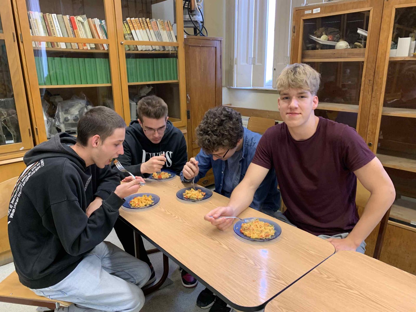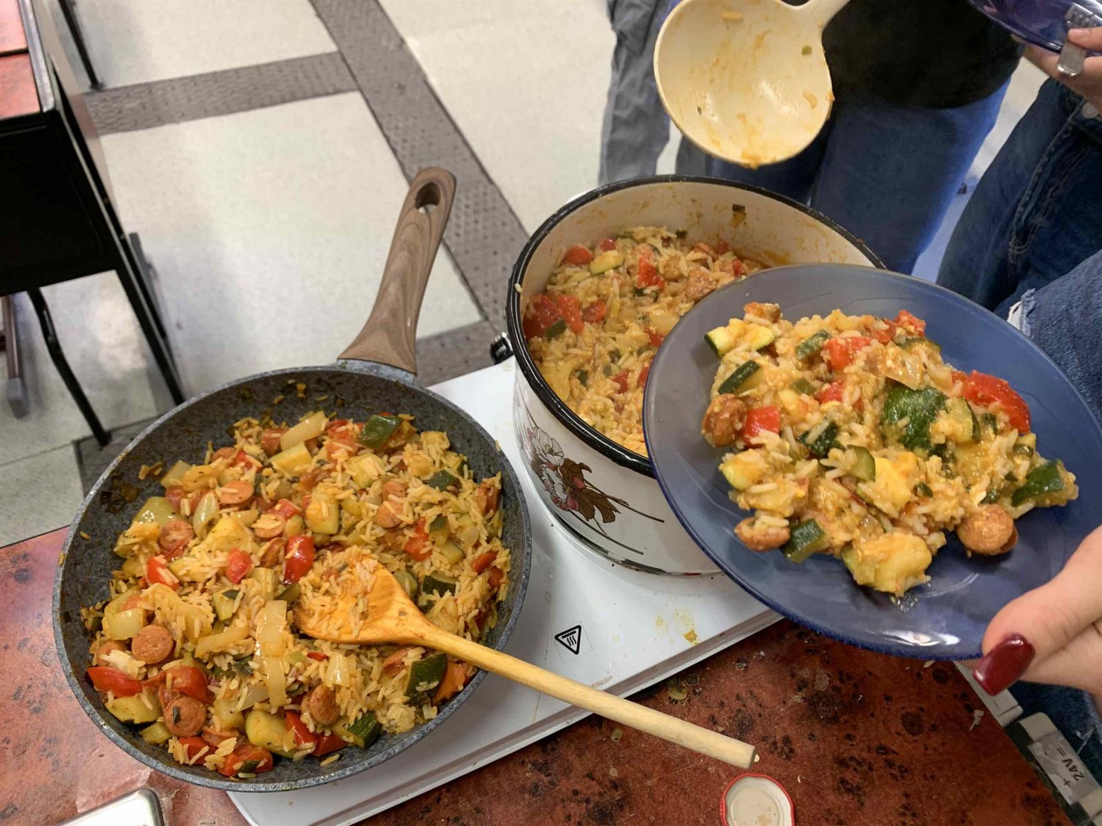 A végeredmény a fotókon látható gyümölcssaláta lett és egy mediterrán jellegű zöldséges, adalékanyagmentes kolbásszal készült ragu, amelyet kétféle változatban is elkészítettek. A projekt zárásaként közösen elfogyasztották az elkészült ételeket és minden csoport beszámolt a végzett munkáról. Mindenki nagyon jól érezte magát közben, hiszen a feladatok kötetlen jellege lehetővé tette a szabad mozgást, minden csapat megnézte, mivel foglalkoznak a többiek. Utólag többen is mondták, hogy jobban meg fogják nézni az élelmiszerek csomagolását vásárlás közben, hogy ne vegyenek meg veszélyes adalékokat tartalmazó termékeket.