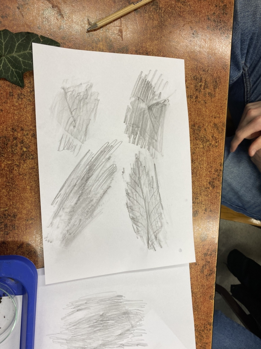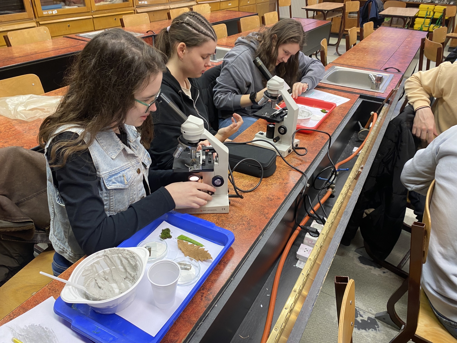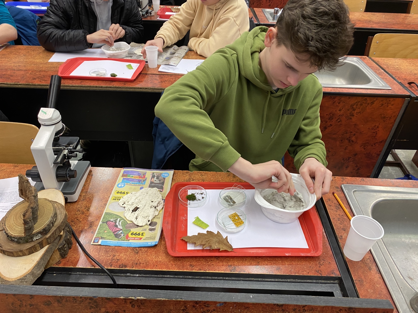 A keddi foglalkozásunkon ismerkedtünk az erdők életközösségeivel, sokféleségével, bonyolult táplálékhálózatával, az élő és élettelen környezet kapcsolatával. Az energiaáramlás során hogyan hasznosítják a fák a fényenergiát és alakítják át szerves anyaggá. A társulás fő alkotói a fák, így megvizsgáltuk mikroszkópban a leveleket, elsajátítva a levélnyúzat készítését. Az iskolaudvaron lévő fán kéregnyomatot készítettünk gipszöntéssel, satíroztuk a kérget és az erdőben gyűjtött leveleket. Lehetőség volt egy kis kreativitásra is levélkép és levélmedál készítésével.