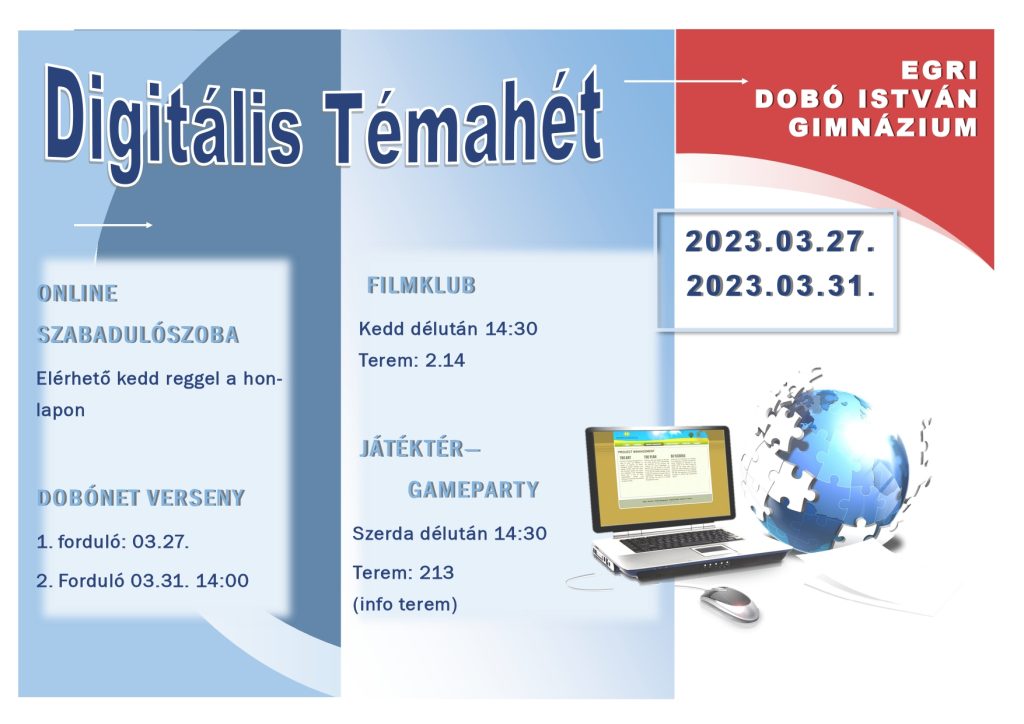 2023. március 27-től március 31-ig keressétek a Digitális Témahét idei programjait. Többek között online szabadulószobával, filmklubbal, játéktér – gameparty-val, és DobóNet Versennyel várunk Benneteket!