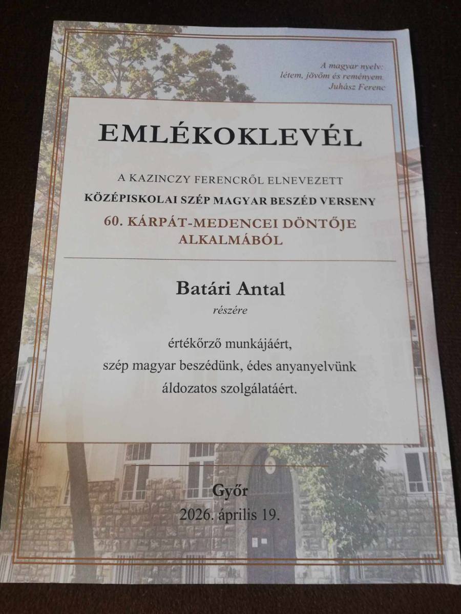 A 2026. április 19-én Győrben megrendezett, a Kazinczy Ferencről elnevezett középiskolai Szép Magyar Beszéd Verseny 60. Kárpát-medencei döntőjén Batári Antal több évtizedes, kiemelkedő nyelvművelő tevékenységéért emléklapot vehetett át. Munkássága példaértékű mindannyiunk számára, hiszen hosszú éveken át elkötelezetten szolgálta a magyar nyelv ápolását, a szép és igényes beszéd ügyét.