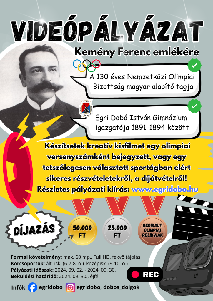 Az Egri Dobó István Gimnázium (a továbbiakban: EDIG) 2024. szeptember 2-től videópályázatot hirdet általános iskolás és középiskolás tanulók számára. A videópályázat a 2024. október 18-án, pénteken megrendezésre kerülő, „Az olimpia itt kezdődött…” című ünnepélyes programsorozat egyik kiemelt része, amely az EDIG egykori igazgatójának, a pedagógus és sportszervező Kemény Ferencnek kíván méltó emléket állítani. Kemény Ferenc személyében a 130 éve alapított Nemzetközi Olimpiai Bizottság (NOB) magyar alapító tagját tisztelhetjük, akire nagyszabású sporttörténeti konferenciával és emléktábla elhelyezésével emlékezünk halálának 80. évfordulóján.