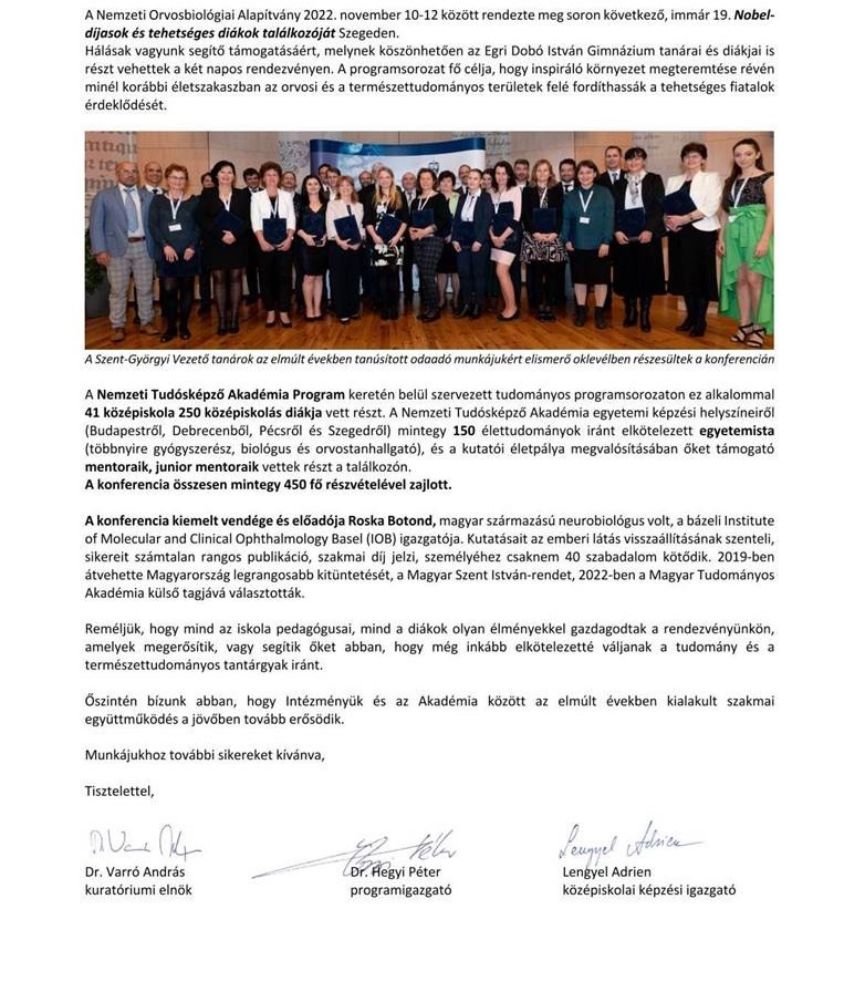 A program keretében 2022. november 11-13. között először vehettünk részt a „Nobel-díjasok és tehetséges diákok találkozója” konferencián Szegeden. A program kiemelt vendége volt Dr. Roska Botond, aki a látás helyreállításán dolgozik és jelenlegi kutatási eredményeit mutatta be. Kutatásának célja, hogy helyreállítsa a vak retinák színlátását, létrehozzon egy intelligens optogenetikai szemüveget, valamint megvizsgálja a ganglionsejtek pusztulásának mechanizmusát. A professzor úr mellett orvosi egyetemek jeles kutatói, a programban résztvevő egyetemi hallgatók tartottak előadást kutatási témáikról és azok eredményeiről. A középiskolás diákoknak lehetőségük volt kérdezni az előadások után, illetve kerekasztal beszélgetéseken részt venni. A tartalmas programok óriási motivációt jelentettek diákjaink számára a további fejlődésre.