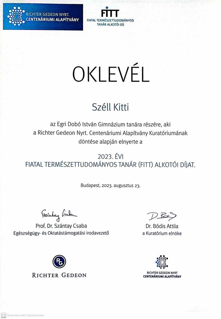 Idén második alkalommal került átadásra a Richter Gedeon Centenáriumi Alapítvány által létrehozott Fiatal Természettudományos Tanár (FITT) alkotói díj, melyet iskolánkból Széll Kitti tanárnő nyert el.