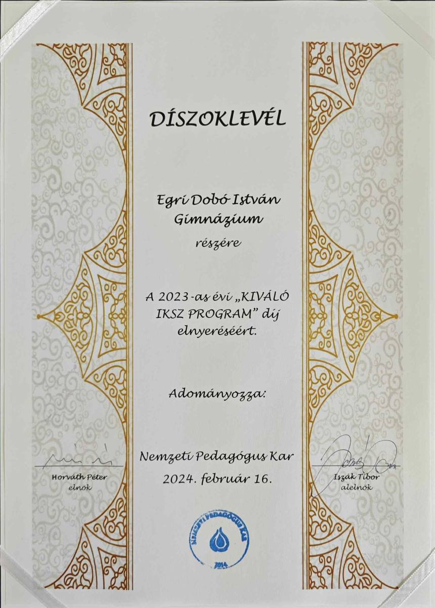 A monitoring vizsgálatok során a 2022/2023-as tanévben az országos összesítések eredményeként az Egri Dobó István Gimnázium bizonyult példaértékű, kimagasló munkát végző oktatási intézménynek e téren! Ennek megfelelően a Köztestület által alapított „Kiváló IKSZ Program” díját az Egri Dobó István Gimnázium nyerte el, melynek átadására a Nemzeti Pedagógus Kar – Országos Küldöttgyűlésén került sor 2024. február 16-án Budapesten.