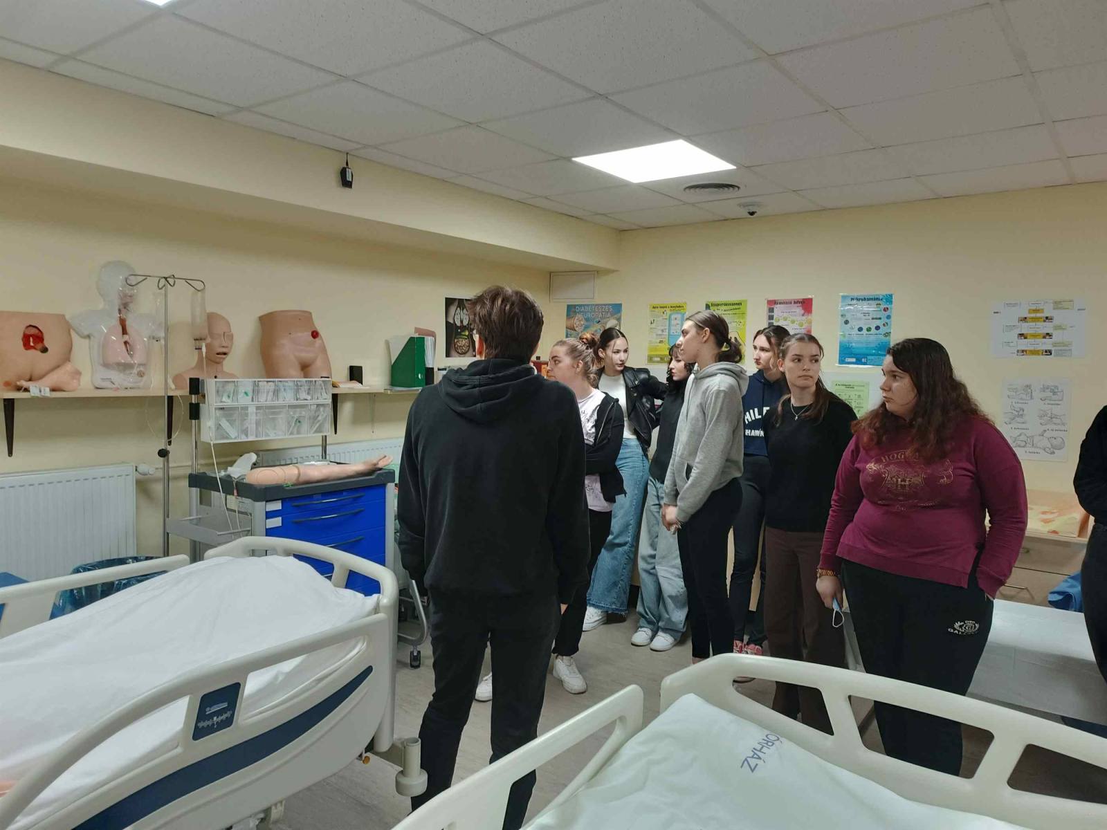 Április 19-én az idei tanév utolsó kórházlátogatására került sor, amelyen három iskola (Dobó, Neumann, Szilágyi) egészségügy iránt érdeklődő 15 diákja vett részt. A csoportot először az Egri Markhot Ferenc Oktató Kórház orvosigazgatója, Dr. Maszárovics Zoltán köszöntötte, aki beszélt a kórház múltjáról, az egykori egri orvosképzésről és a jelenről. A látogatás során a diákok megismerkedtek az emberi szervezet felépítésével, működésével, elváltozásaival, a központi laborban a vér- és vizeletvizsgálat orvosdiagnosztikai jelentőségével és azzal, hogy az egyes összetevők megváltozása milyen betegségekre utalhat. Végül a Scill laborban a betegellátás, ápolás gyakorló helyszínén, olyan modelleket, eszközöket láthattak, amelyek segítik a mindennapokra való felkészülést, a gyakorlást és vizsgahelyszínként is működnek.