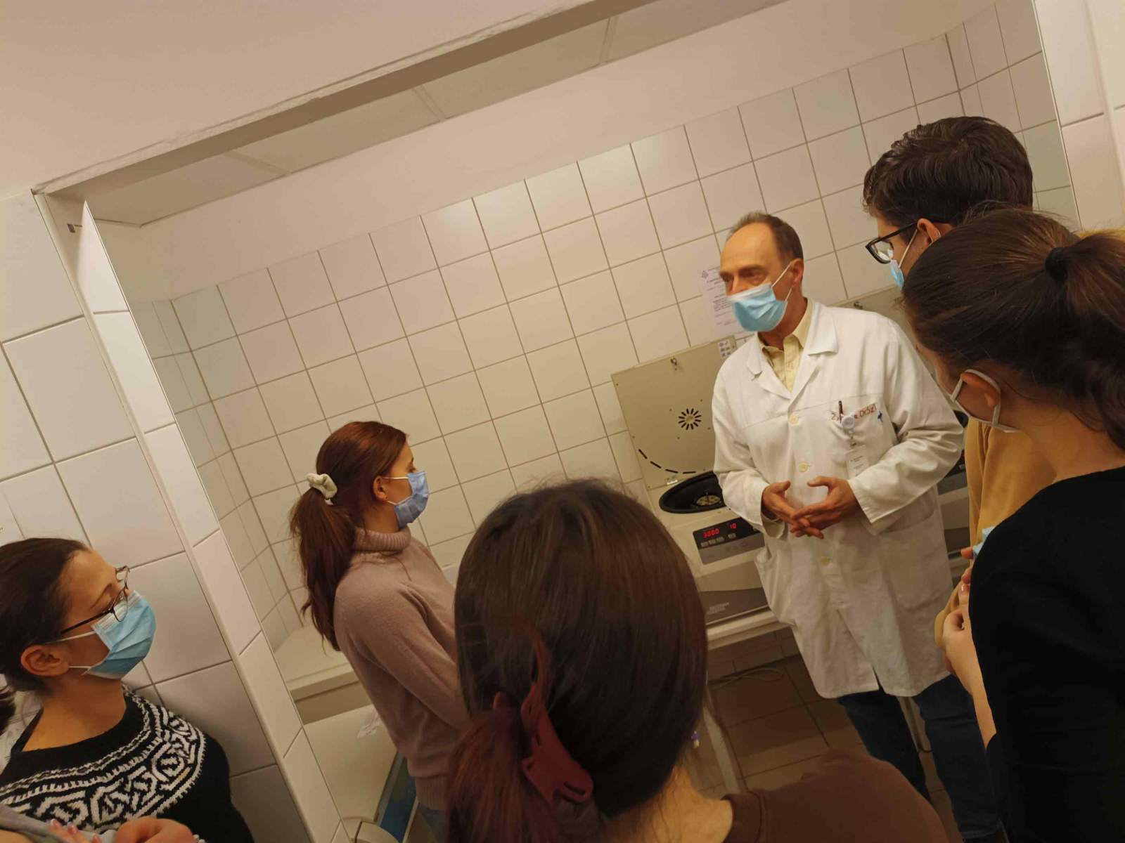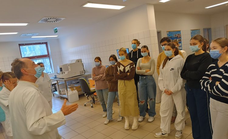 Ezután a Patológián Dr. Vadnay István doktor úr segítségével az emberi szervezet anatómiai felépítésével és működésével ismerkedtünk, majd a Központi laborban láthattuk hogyan történik a vér- és vizeletminták feldolgozása és kiértékelése. Dr. Szoboszlay István osztályvezető főorvos beszélt arról, hogy milyen végzettség szükséges ahhoz, hogy valaki a labor munkatársa lehessen. A csoport megosztva az egyes munkaállomásokon ismerkedett meg a kiértékelés lépéseivel, hallhatta, hogy milyen eltérések, milyen elváltozásra, betegségre utalhatnak, hogyan segíthetik a betegségek diagnosztikáját, az orvosi kezelések módjának meghatározását.