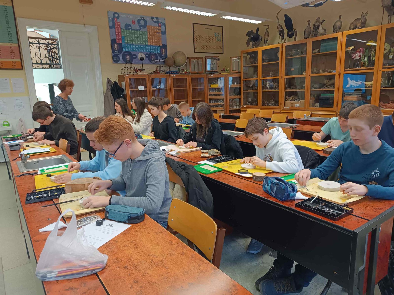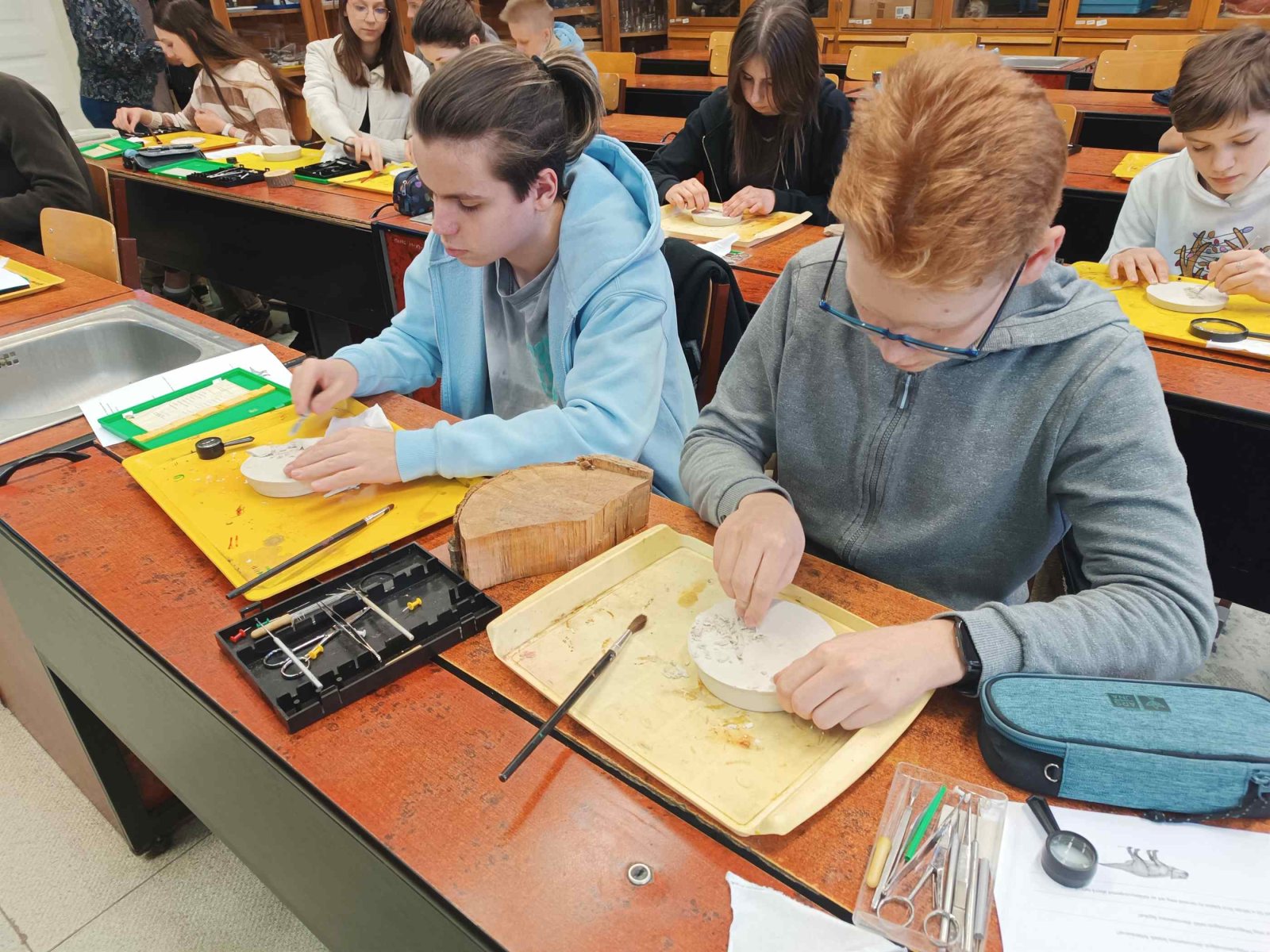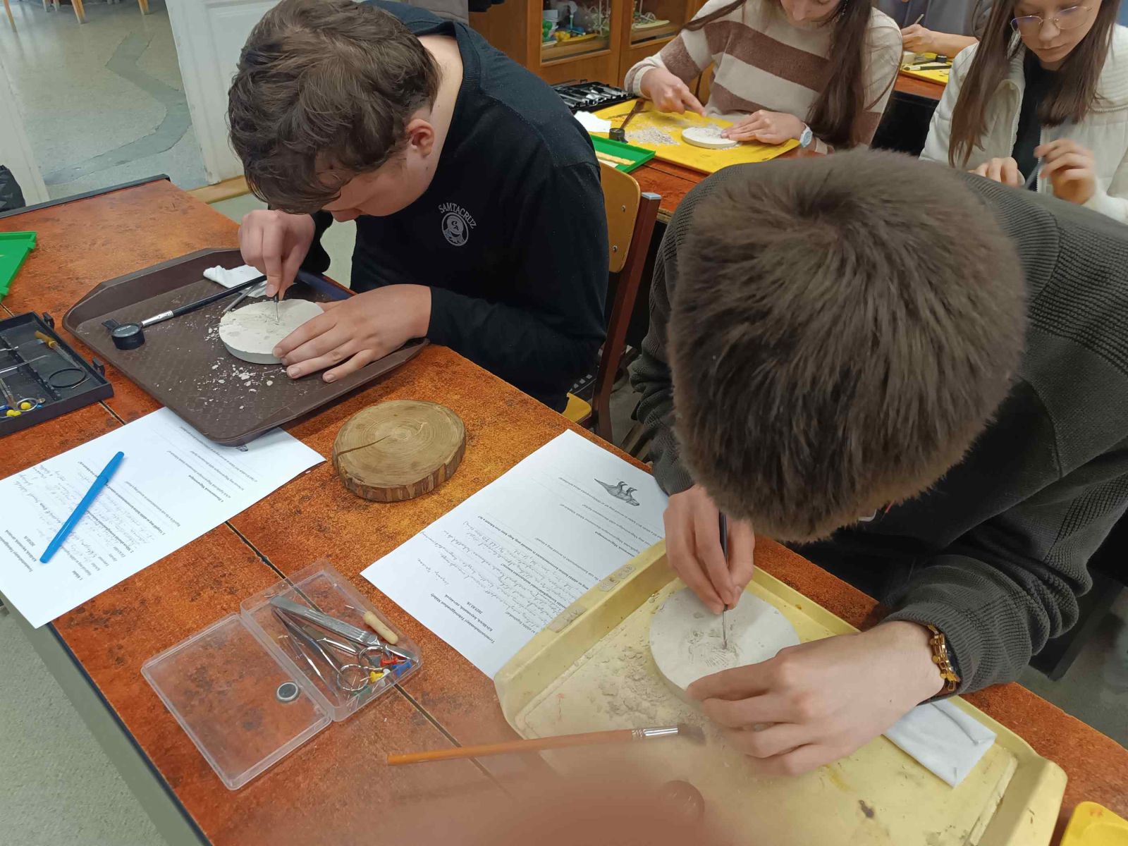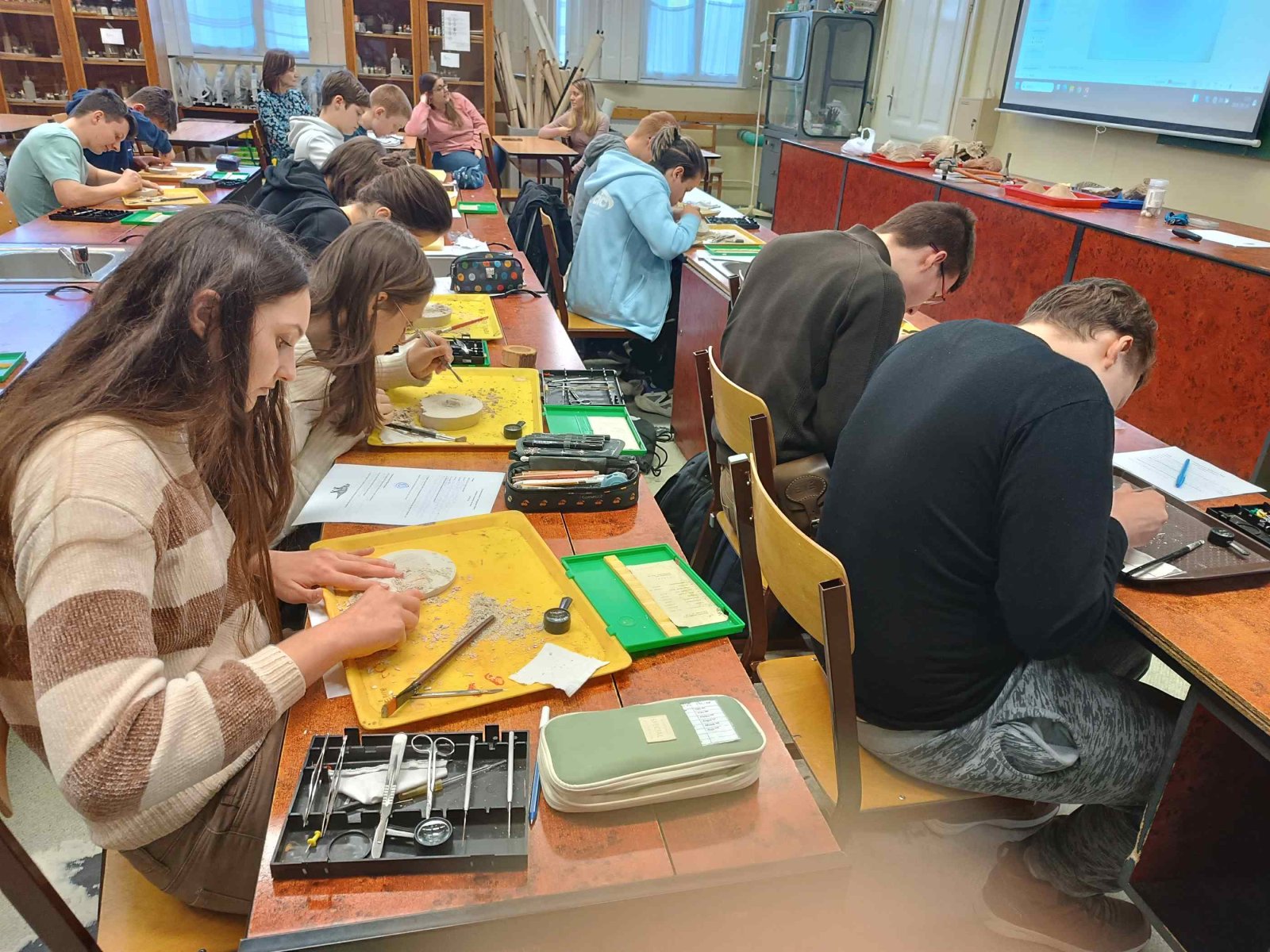A március 18-án a TT műhely tagjaival visszautaztunk az időben. Megismerkedtünk a kövület, lenyomat, fosszília, zárvány fogalmával, megtudtuk, hogy még ma is élnek „élő kövületek” Földünkön. Megtudtuk, hogy milyen módszerekkel tudjuk meghatározni a leletek és a kőzetek korát. Mi is végeztünk évgyűrűelemzést és a paleontológusok által is használt eszközökkel feltárást végeztünk. Kezünkbe vehettük az iskola fosszília- és kövület gyűjteményének néhány érdekes és értékes példányát. Megemlékeztünk Legányi Ferenc paleontológus és muzeológus egykori diák munkásságáról is.