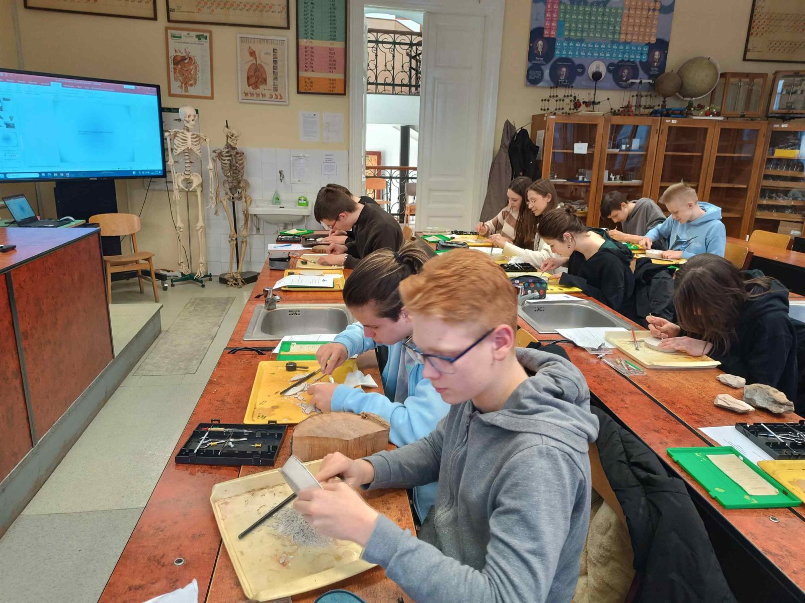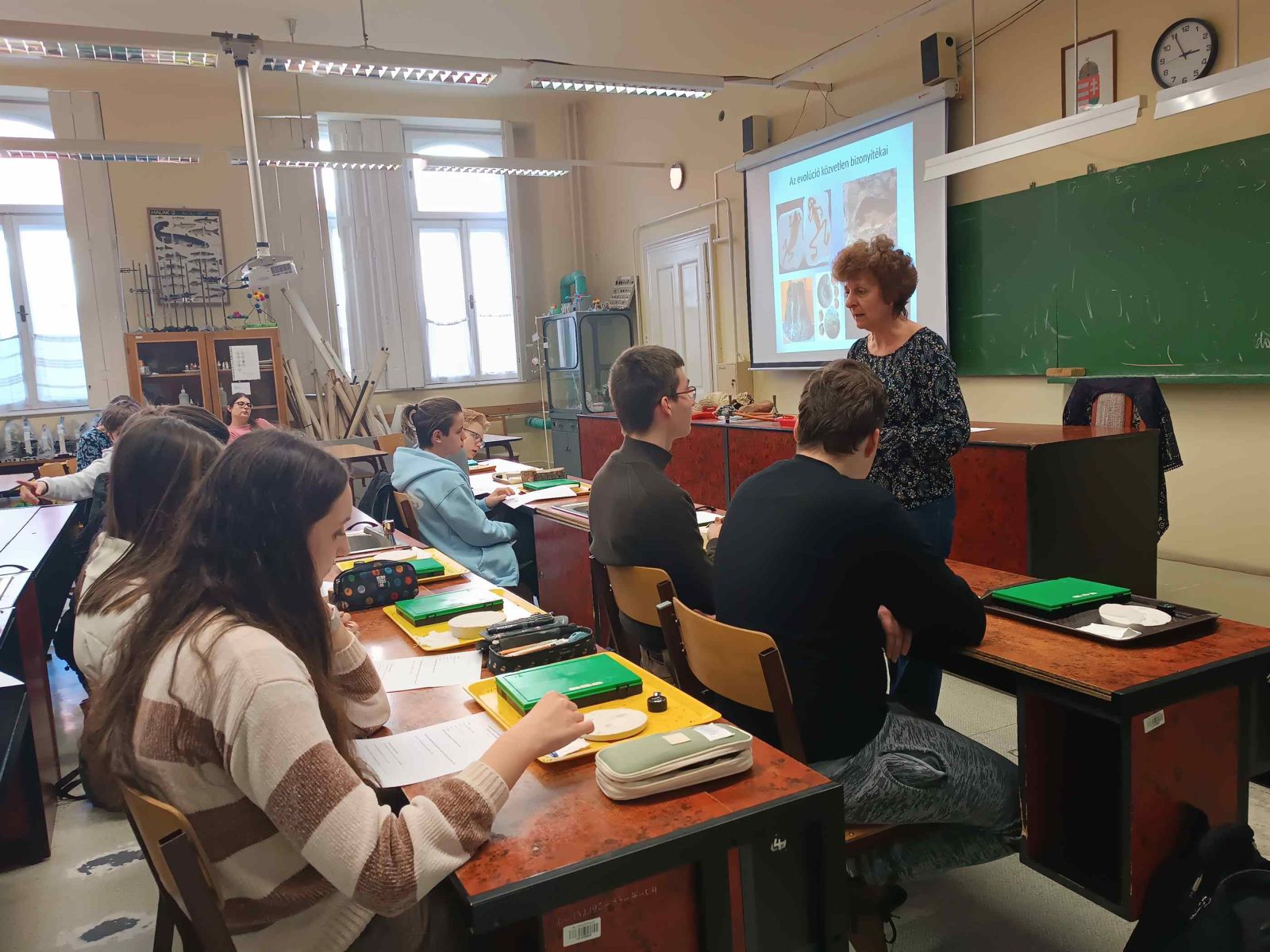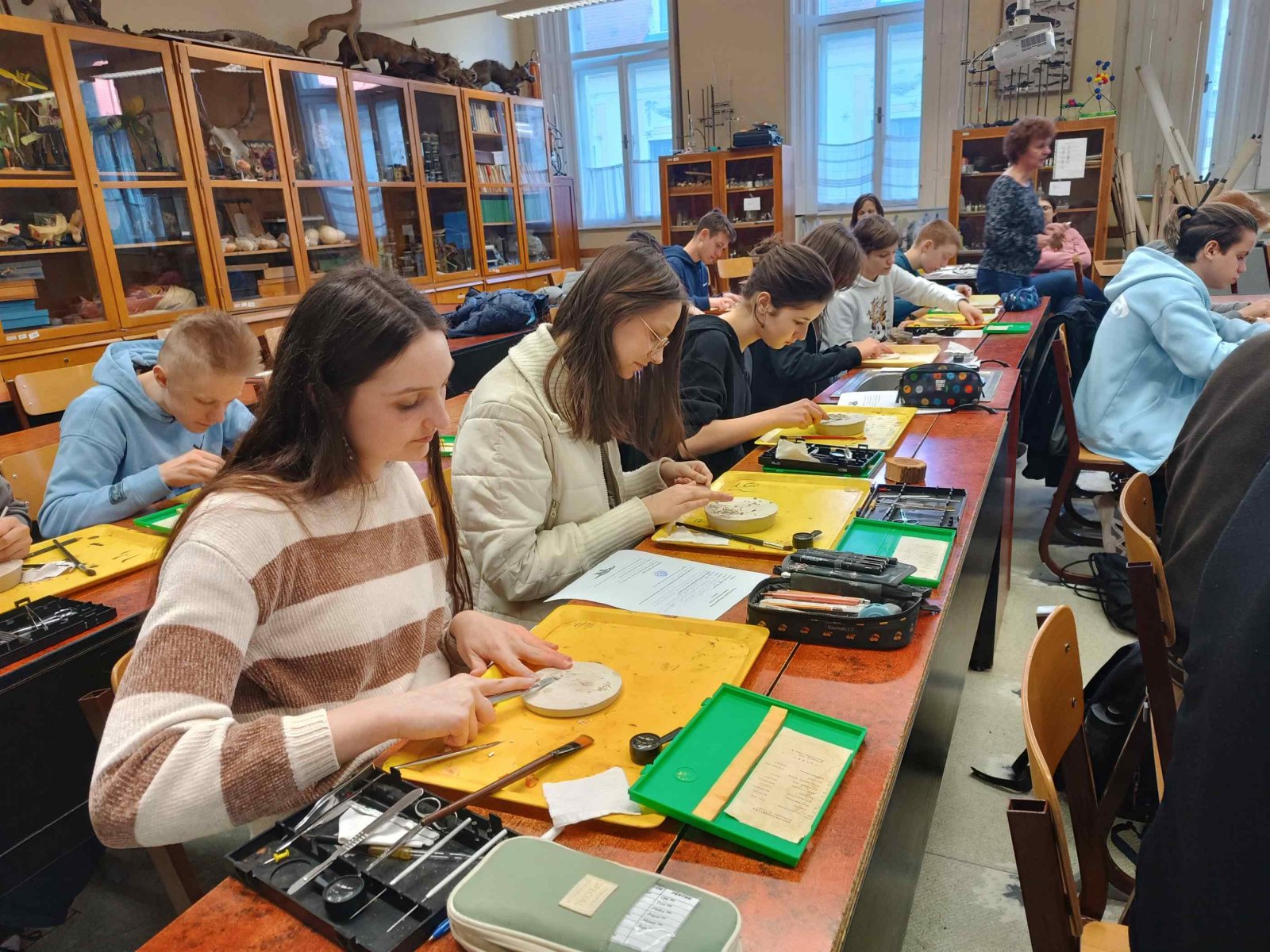 A március 18-án a TT műhely tagjaival visszautaztunk az időben. Megismerkedtünk a kövület, lenyomat, fosszília, zárvány fogalmával, megtudtuk, hogy még ma is élnek „élő kövületek” Földünkön. Megtudtuk, hogy milyen módszerekkel tudjuk meghatározni a leletek és a kőzetek korát. Mi is végeztünk évgyűrűelemzést és a paleontológusok által is használt eszközökkel feltárást végeztünk. Kezünkbe vehettük az iskola fosszília- és kövület gyűjteményének néhány érdekes és értékes példányát. Megemlékeztünk Legányi Ferenc paleontológus és muzeológus egykori diák munkásságáról is.