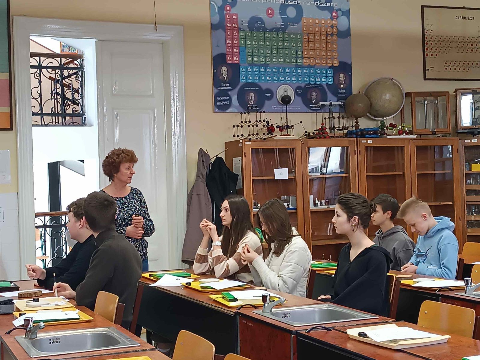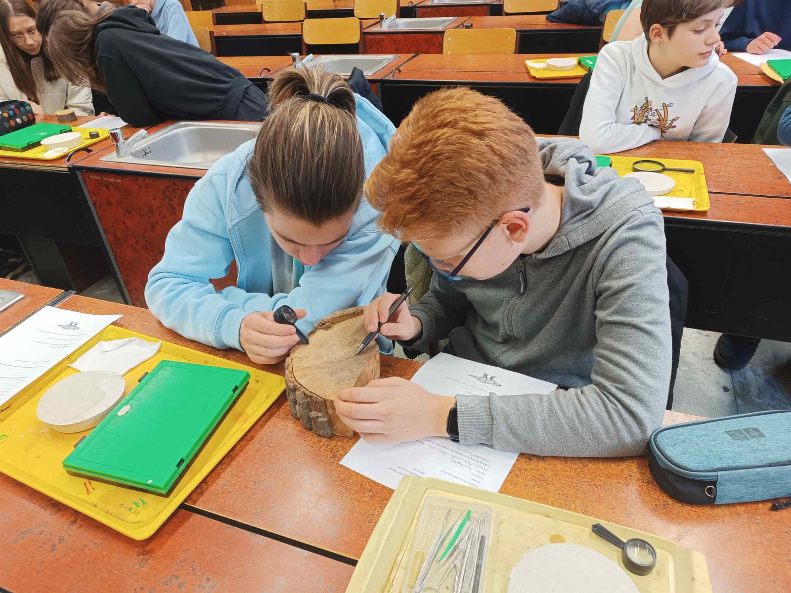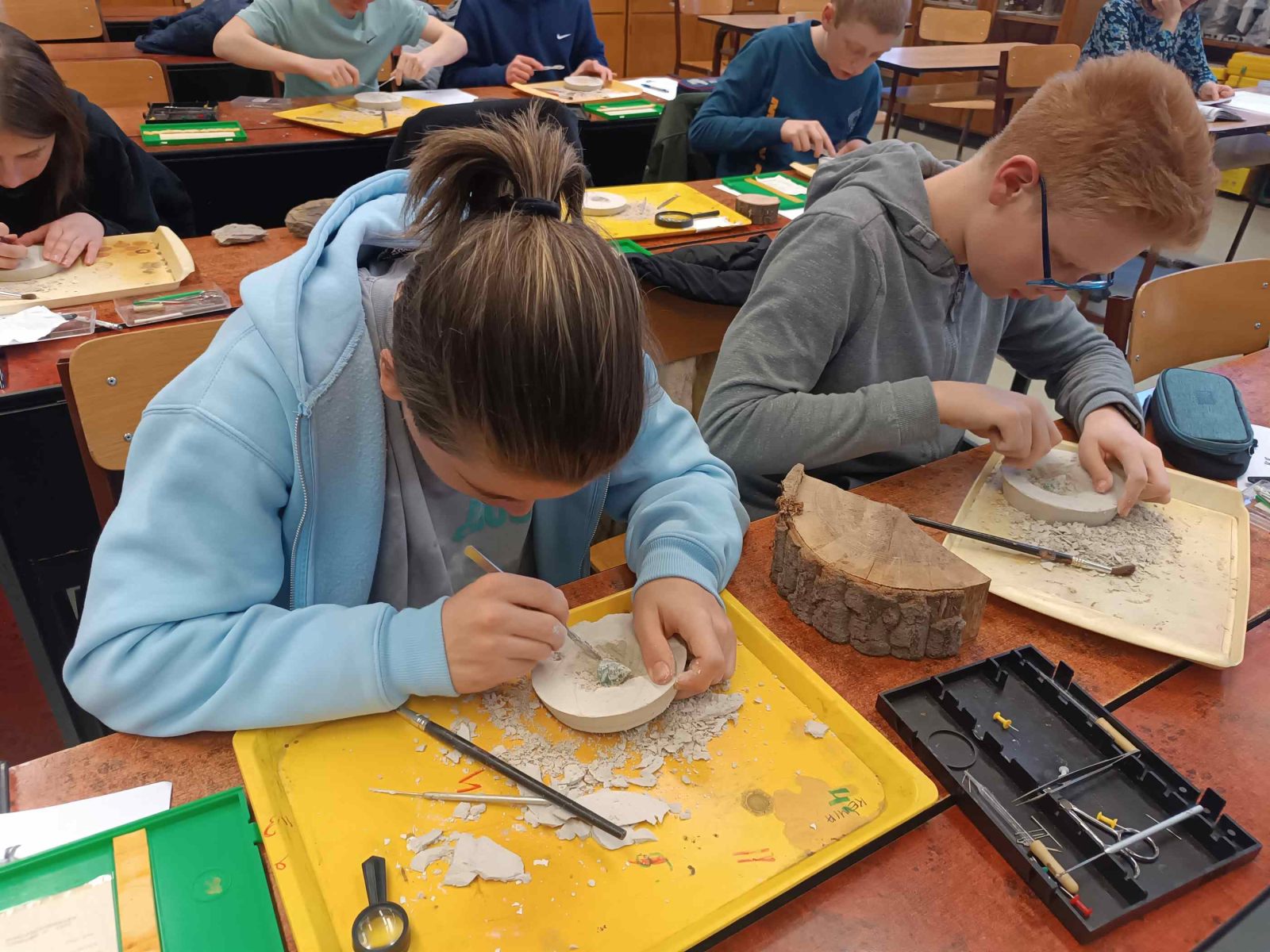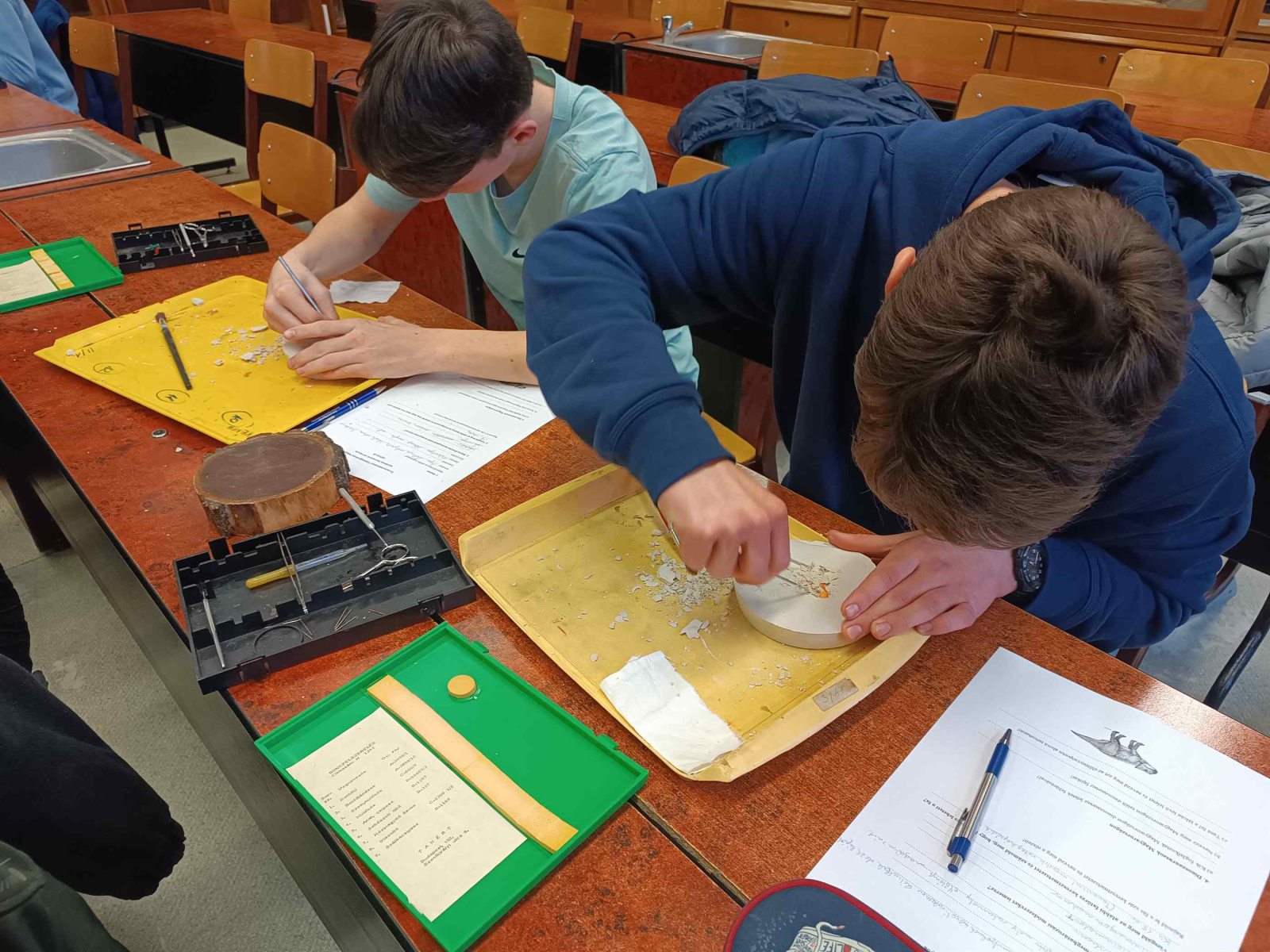 A március 18-án a TT műhely tagjaival visszautaztunk az időben. Megismerkedtünk a kövület, lenyomat, fosszília, zárvány fogalmával, megtudtuk, hogy még ma is élnek „élő kövületek” Földünkön. Megtudtuk, hogy milyen módszerekkel tudjuk meghatározni a leletek és a kőzetek korát. Mi is végeztünk évgyűrűelemzést és a paleontológusok által is használt eszközökkel feltárást végeztünk. Kezünkbe vehettük az iskola fosszília- és kövület gyűjteményének néhány érdekes és értékes példányát. Megemlékeztünk Legányi Ferenc paleontológus és muzeológus egykori diák munkásságáról is.