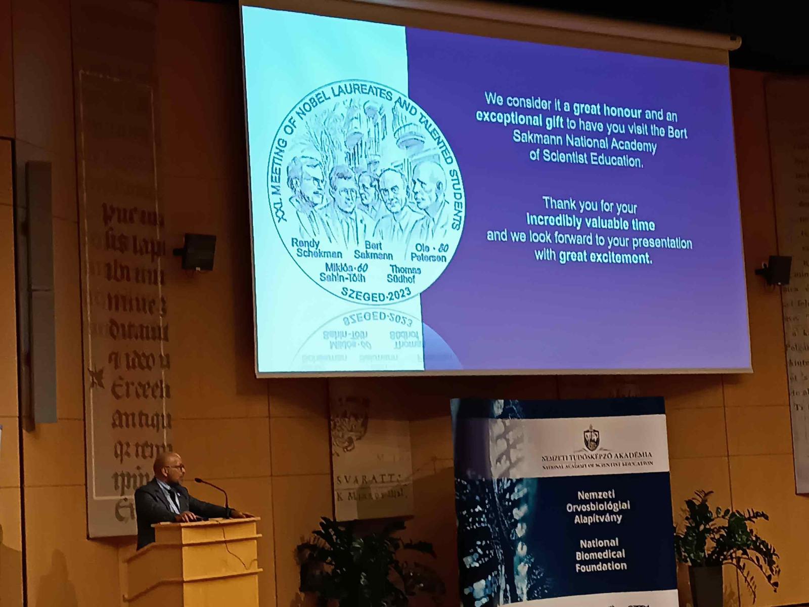 A Nemzeti Tudósképző Akadémia pedagógusai és diákjai 2023. december 13-15. között Szegedre látogattak, ahol nem mindennapi élményben lehetett részük. Az angol nyelvű konferencia keretében két Nobel-díjas tudós Randy W. Schekman és Thomas C. Südhof előadását hallgatták meg, akik 2013-ban kapták meg kutatásaikért a Fiziológiai és Orvostudományi Nobel-díjat. Ole Petersen a Cardiffi Egyetem professzora 80. születésnapja, Sahin-Tóth Miklós a Kaliforniai Egyetem professzora 60. születésnapja alkalmából kapott meghívást és mutatta be munkásságát. A kutatók nemcsak témáikba vezették be a hallgatóságot, hanem a diákoknak lehetőségük volt kérdezni és kerekasztal beszélgetéseken kicsit jobban megismerni őket. Kedvességük, közvetlenségük mindenki számára megnyerő volt, sőt a közös fotózás életre szóló élményt jelentett mindenki számára.