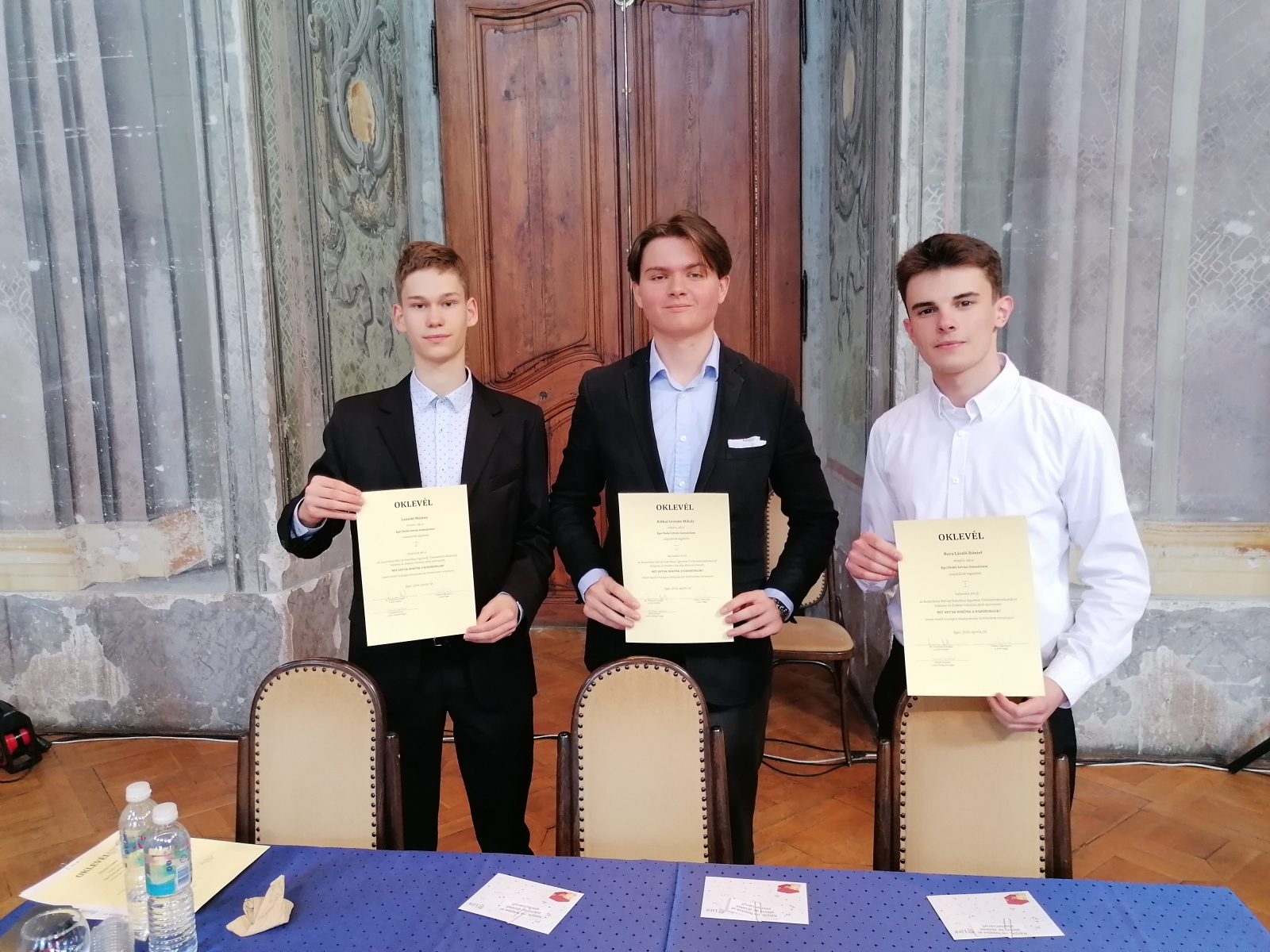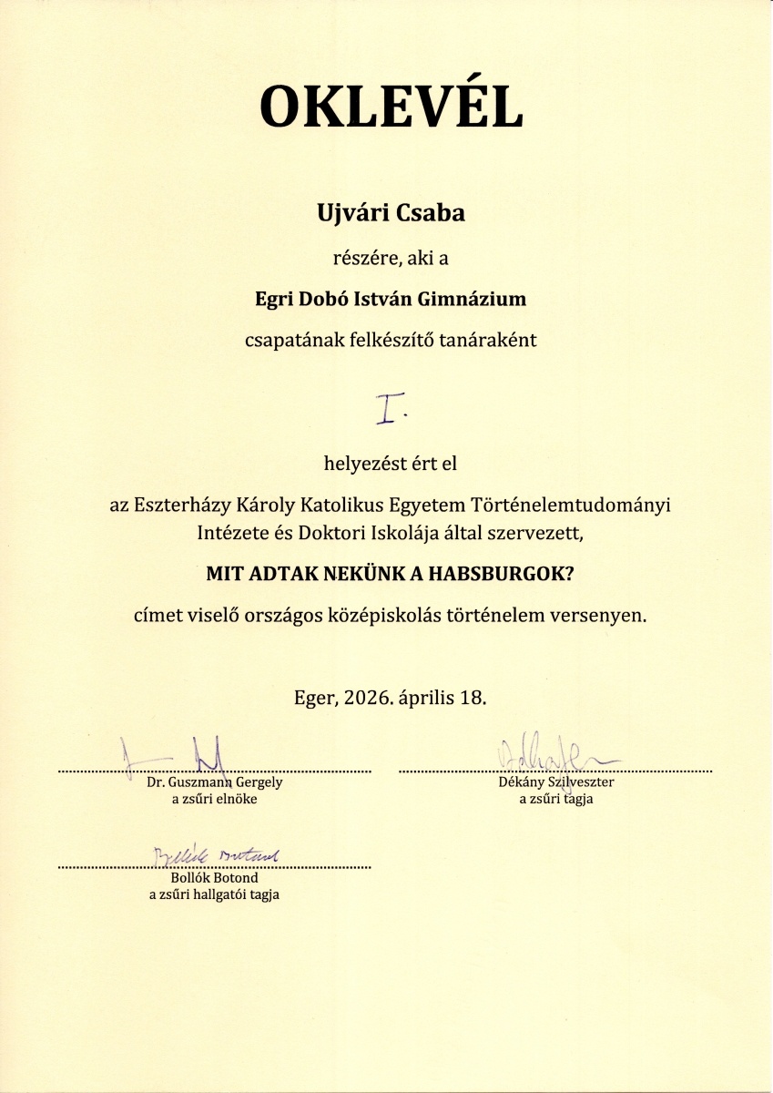 Az Eszterházy Károly Katolikus Egyetem immár 15. alkalommal hirdette meg országos történelem versenyét. Idén a Habsburgok és a magyar történelem kapcsolata volt a téma: „Mit adtak nekünk a Habsburgok?” címmel. Az 50 induló közül iskolánk „Inseparabiliter” nevű csapata: Bora László Dániel, Lanszki Márton 11. a és Rátkai Levente 12. c osztályos tanulók a decembertől tartó 3 írásbeli fordulón sikeresen túljutva bekerültek az április 18-án megrendezett szóbeli döntő legjobb 9 csapata közé. A Dobónak ez egyébként tizenharmadszorra sikerült! Itt a hat feladatot olyan kiválóan oldották meg (köztük egy 1921-es nemzetgyűlési felszólalást, szituációs játékként), hogy „triászunk” megszerezte az 1. helyet.