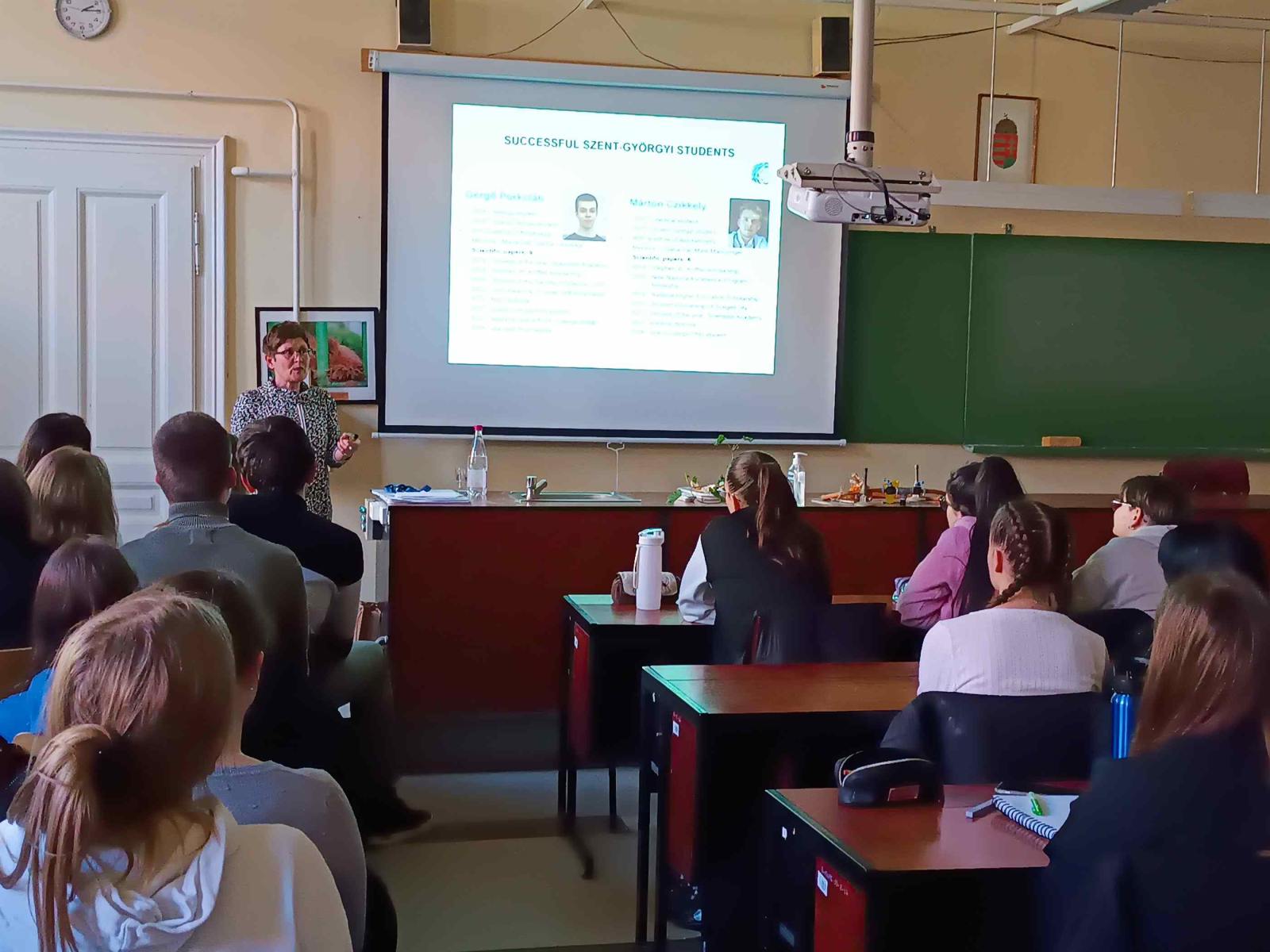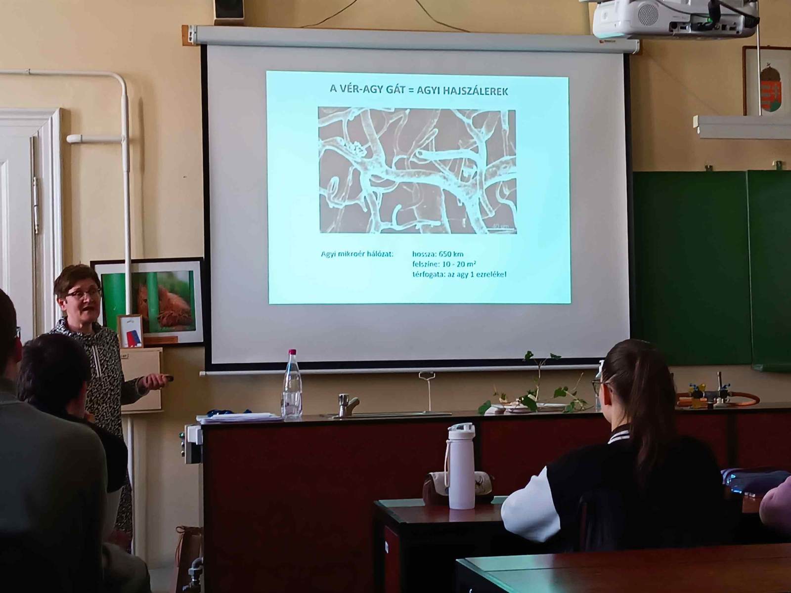 A Nemzeti Tudósképző Akadémia Egri Területi Központ meghívására a Szegedi Biológiai Kutatóközpont neves tudósa látogatott el hozzánk, aki a vér-agy gátról és a chip modellek alkalmazásáról a biológiai kutatásokban tartott előadást. Professzor asszony elmondta, hogy kutatását abban a laborban kezdte meg, ahol egykor Karikó Katalin Nobel-díjas tudósunk végezte kísérleteit. Kutató csoportjával olyan új módszerek kidolgozásán fáradozik, amely segít megérteni a vér-agy gát felépítését és működését. Hallhattuk arról, hogyan történik a sejtek közötti utat lezáró szoros kapcsolatok visszafordítható megnyitása peptidekkel, hogyan tudnak célzottan hatóanyagokat bejuttatni az agyba nanorészecskék segítségével a barrierek szállítófehérjéin át. Vizsgálják agyi betegségek kialakulásának hátterét, a betegségek létrejöttében kulcsfontosságú tényezők hatását a vér-agy gátra. Hogyan lehet a vér-agy gát működését javítani, hogy a kóros állapotok kialakulását akadályozzák.