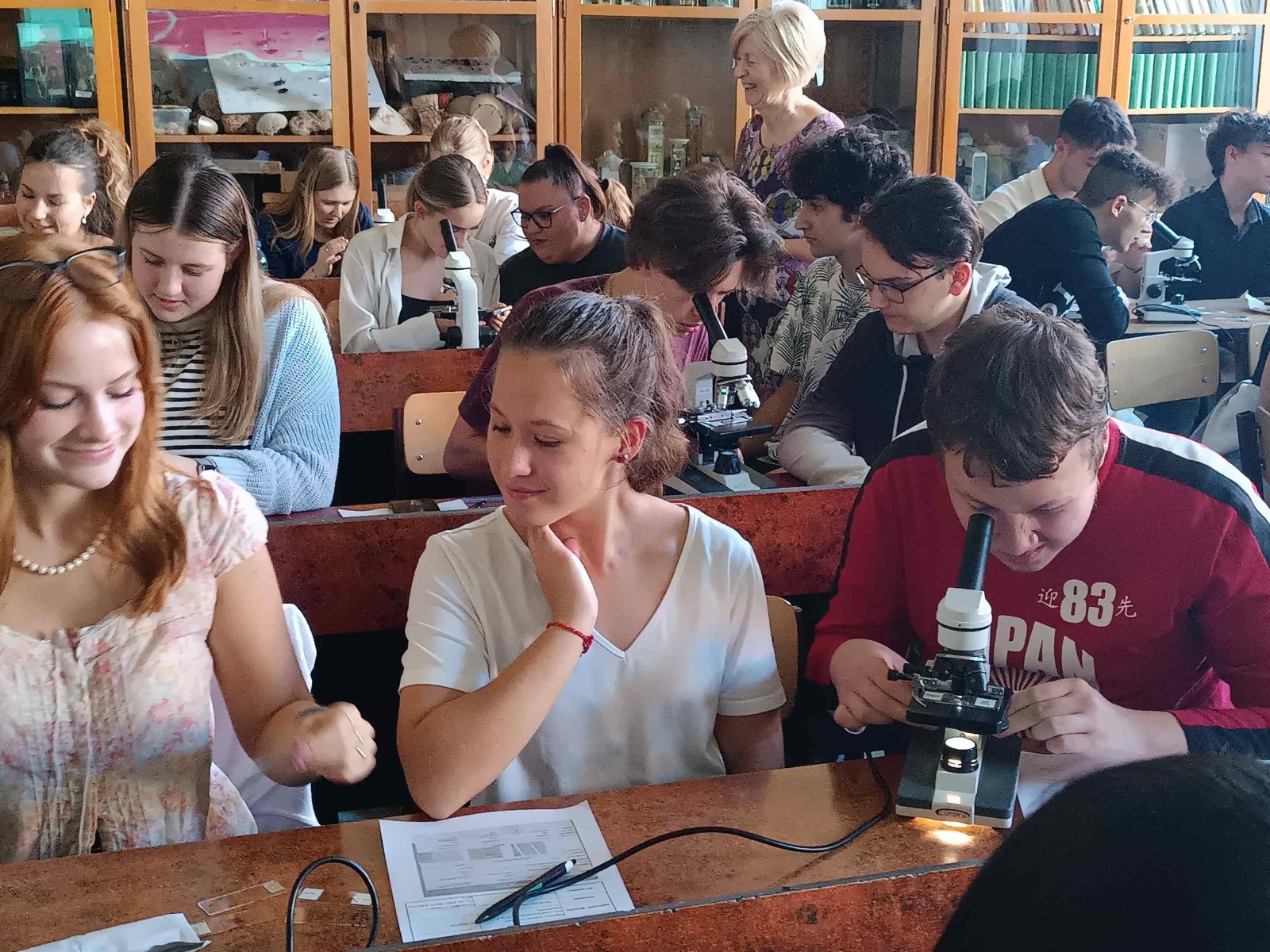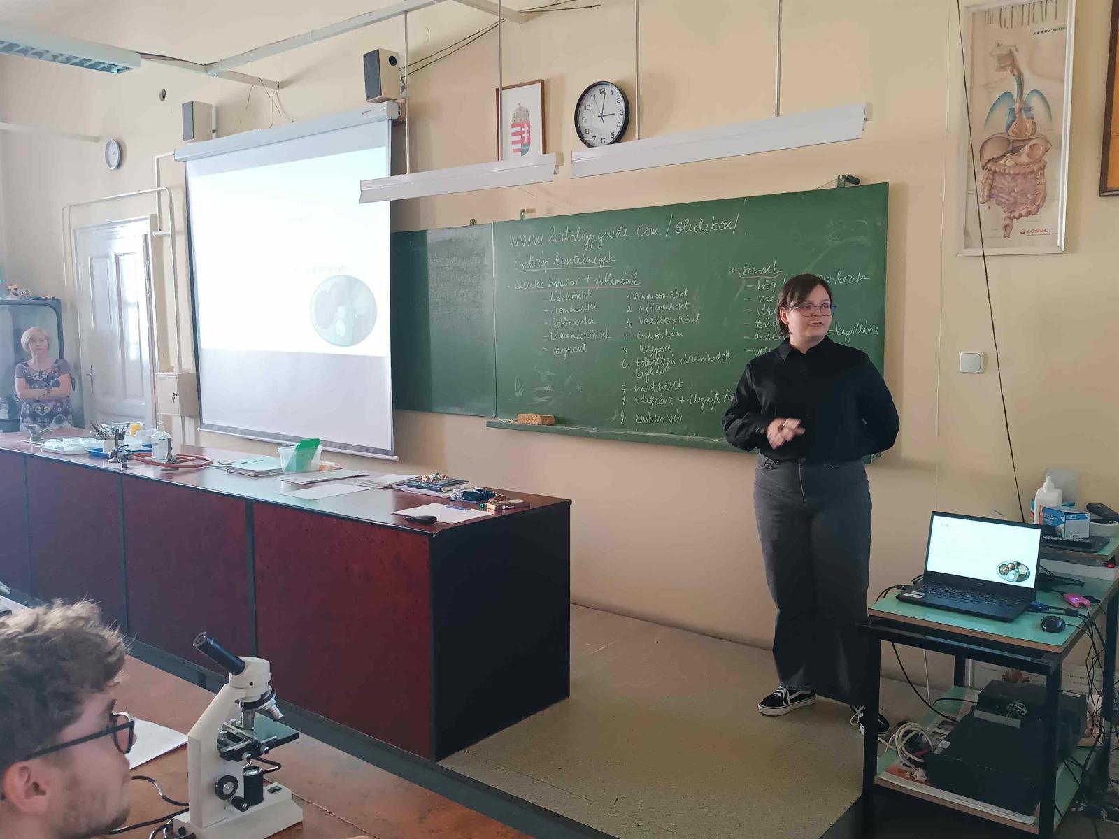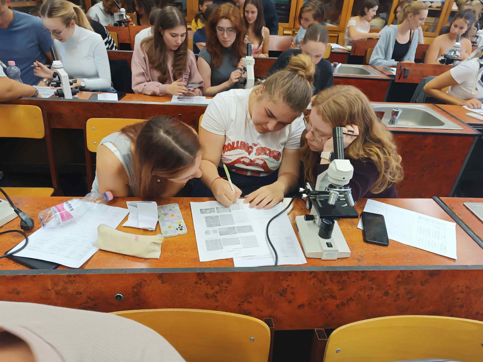 Az idei tanév első foglalkozására szeptember 20-án került sor. A nagyszámú diáksereg először a Nemzeti Tudósképző Akadémia céljait, szervezeti felépítését és a középiskolás diákok lehetőségeit ismerte meg. Ezután Bucsi Tünde végzős Dobós tanuló beszélt az NTA-s nyári tábori élményeiről és a szegedi országos laborgyakorlatáról. A résztvevők az állati és emberi szövettani ismeretei felidézése után láttak hozzá a vizsgálatoknak. Különböző szervekből vett szövettani mintákat elemeztek, figyeltek meg mikroszkóp alatt. A gyakorlat végén feladatlapot töltöttek ki, ahol ellenőrizhették mennyire váltak gyakorlottá a szövetek, szervek felismerésében. A legjobbak apró jutalomban részesültek. A jó hangulatú foglalkozás ismerkedésre is lehetőséget adott, hiszen a város hat középiskolájából érkeztek diákok. Legközelebb kórházlátogatáson vehetnek részt a végzős tanulók.