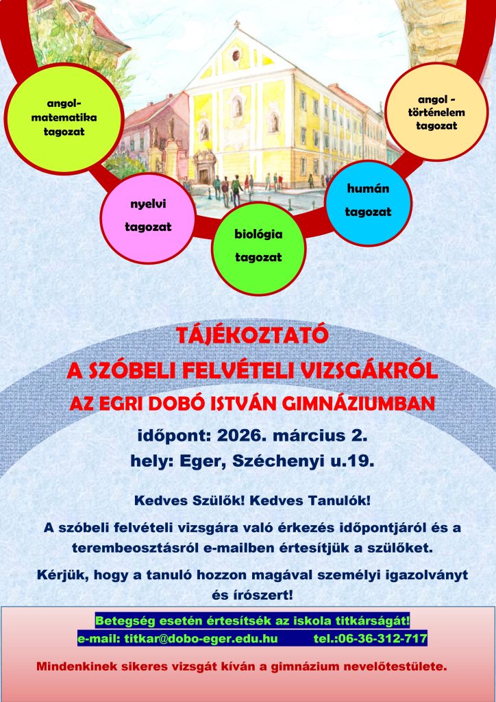 Minden jelentkezőt szeretettel várunk 2026. március 2-án az Egri Dobó István Gimnáziumban és mindenkinek sikeres szóbeli felvételit kívánunk: