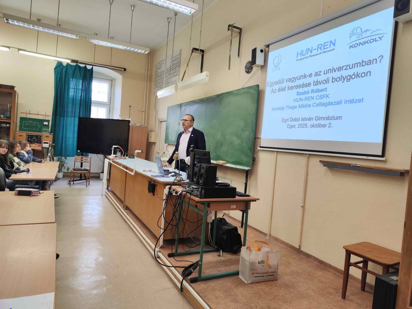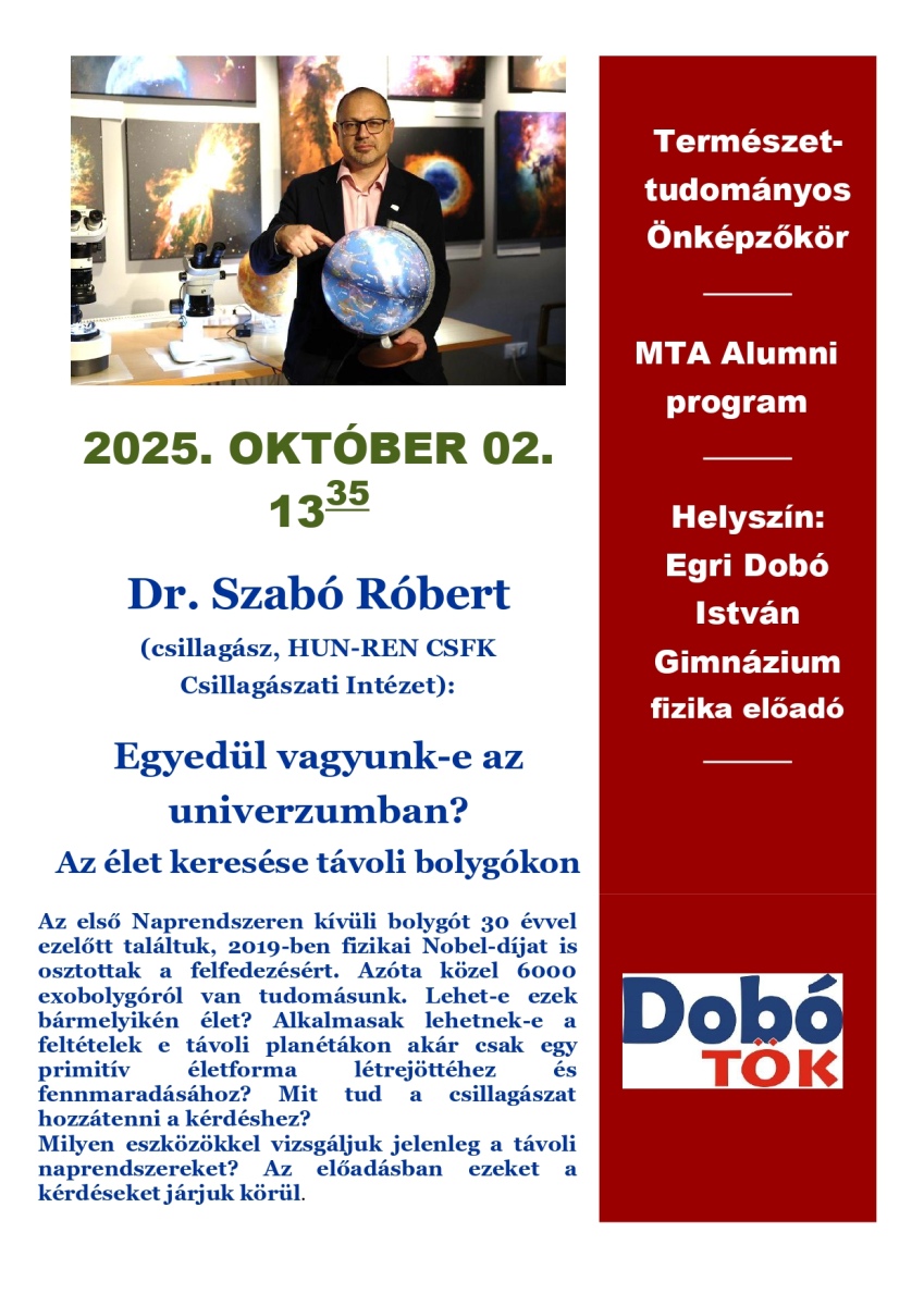 2025. október 2-án Dr. Szabó Róbert csillagász tartott előadást iskolánkban, a Középiskolai MTA Alumni Program keretében. Az előadás a gimnáziumban működő Természettudományos Önképzőkör (TÖK) keretein belül valósult meg.