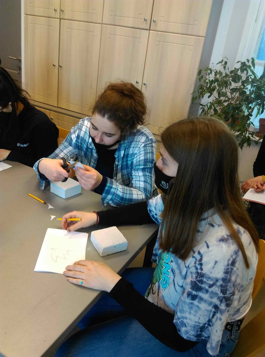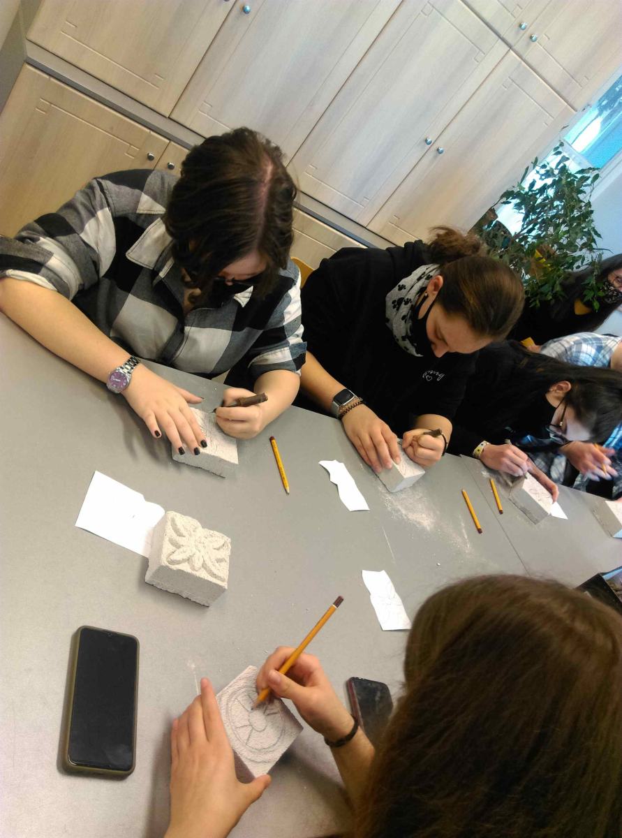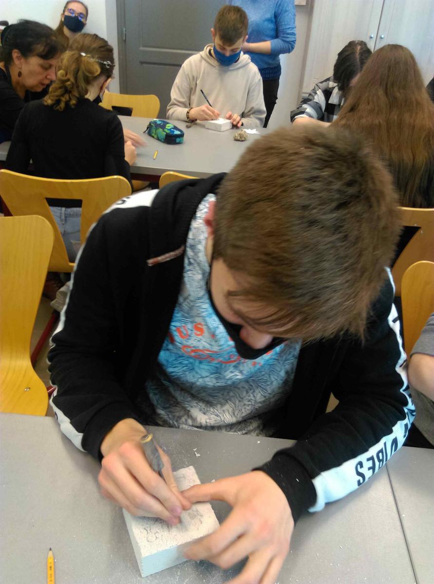 Ezen a foglalkozáson az Egri Dobó István Vármúzeum Várműhelyében múzeumpedagógiai foglalkozáson vettünk részt, amelynek témája a „Mesélő kövek” voltak. Először egy előadáson ismerkedtünk meg a kőfaragó mesterséggel, az építőműhelyek, a céhek alakulásával. A faragott kövek meséltek arról, hogy milyen mesterségbeli tudással rendelkezhettek az egri vár kőfaragói. Ezután mi is kipróbáltuk, hogy mennyire lehetett nehéz dolguk a kőfaragó mestereknek, motívumokat véstünk ytong téglákba.