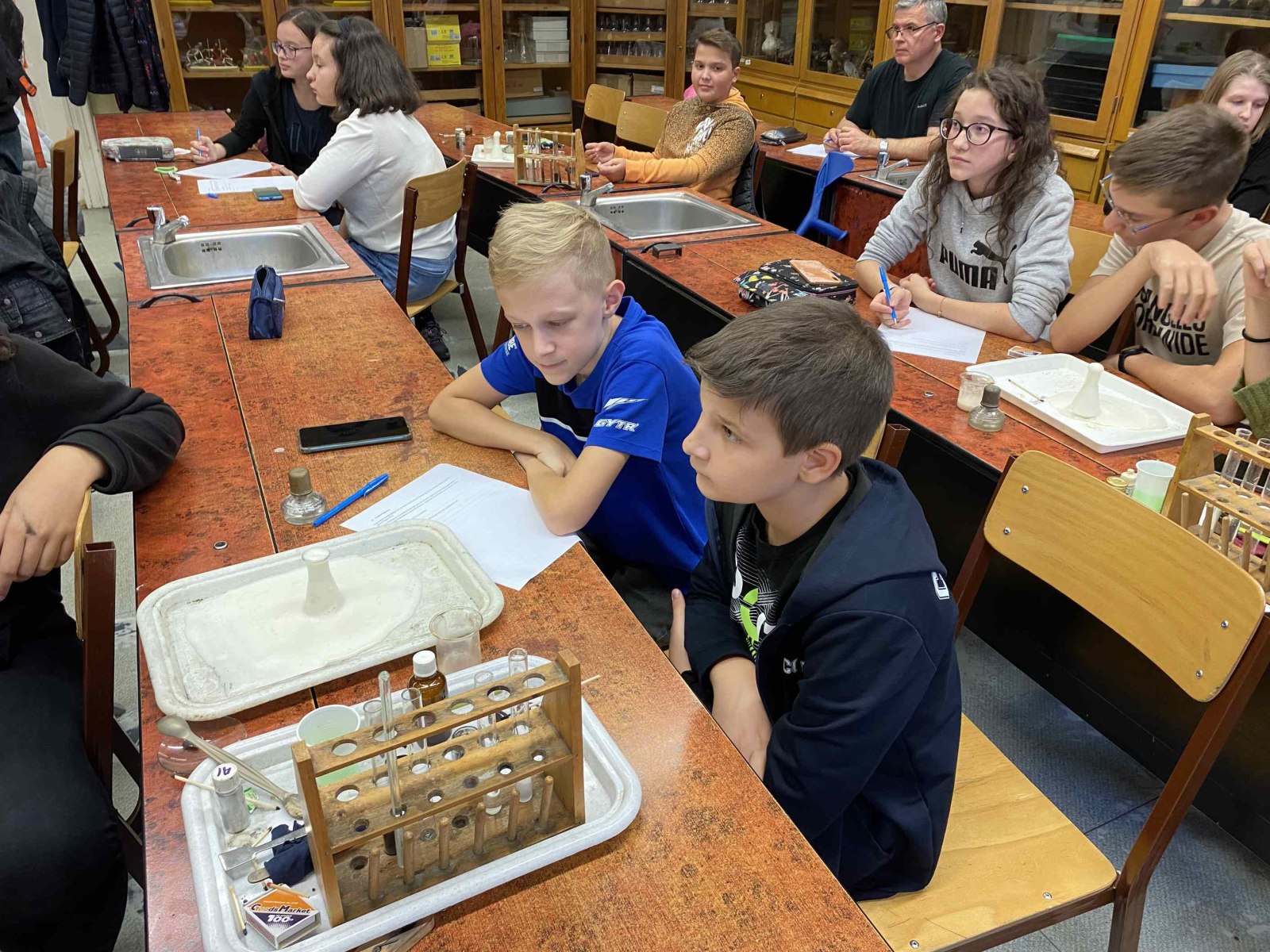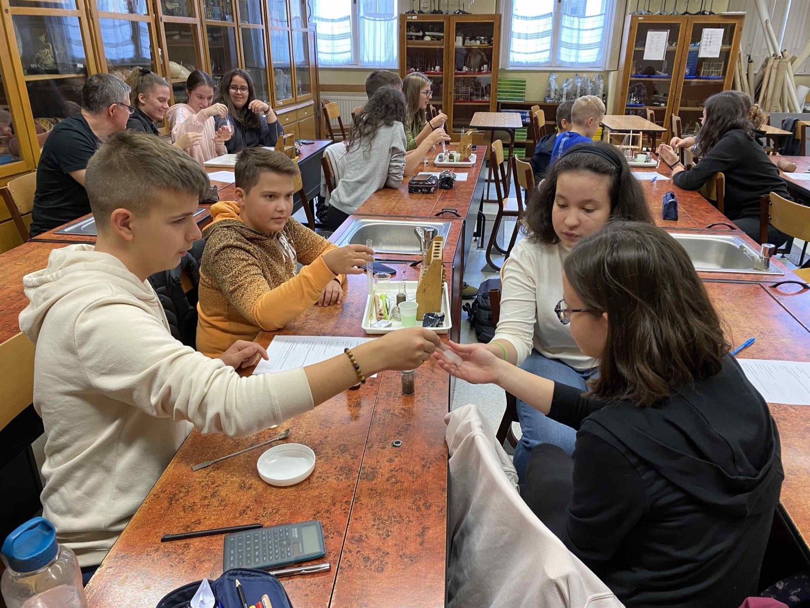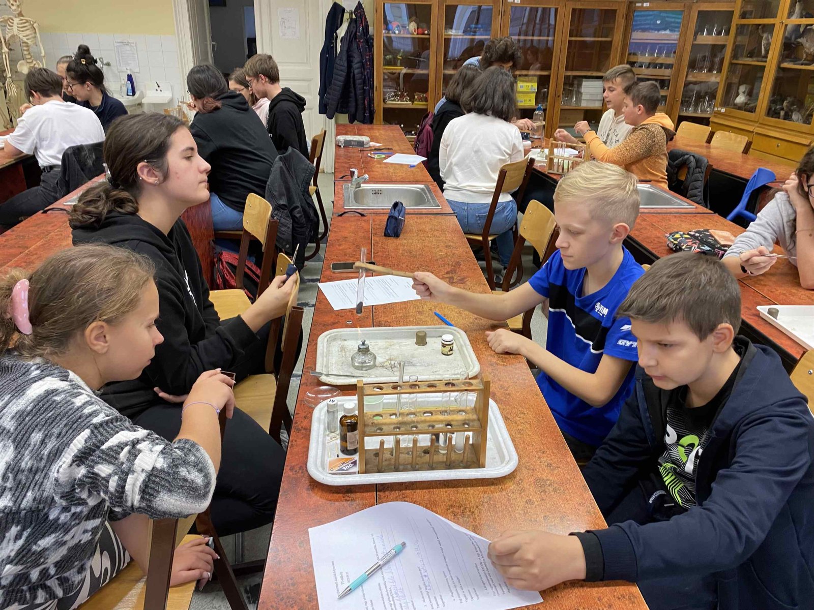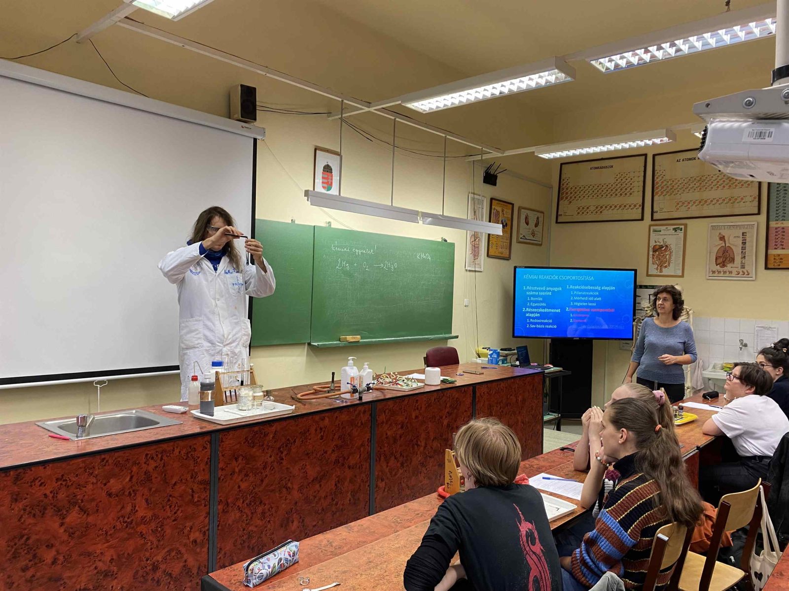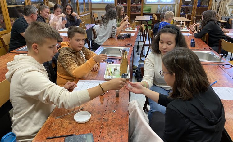 Ez a foglalkozás a kísérletezésről szólt. A diákok csoportokban dolgozva ismerték meg az exoterm és endoterm reakciókat. Kipróbálták a laboreszközöket, elsajátították a kémiai kísérletek elvégzésének helyes módszerét. A foglalkozáson egy régi tanítványunk, egykori műhelytag, is részt vett. Katona Gergő jelenleg Bécsben tanul, vegyész szakos hallgató. Mesélt az egyetemről, tárgyairól, a nehézségekről és a beszélgetés végén néhány kísérletet is bemutatott a hallgatóságnak. Reméljük néhány tanulónkat sikerült megnyernie a kémiának!