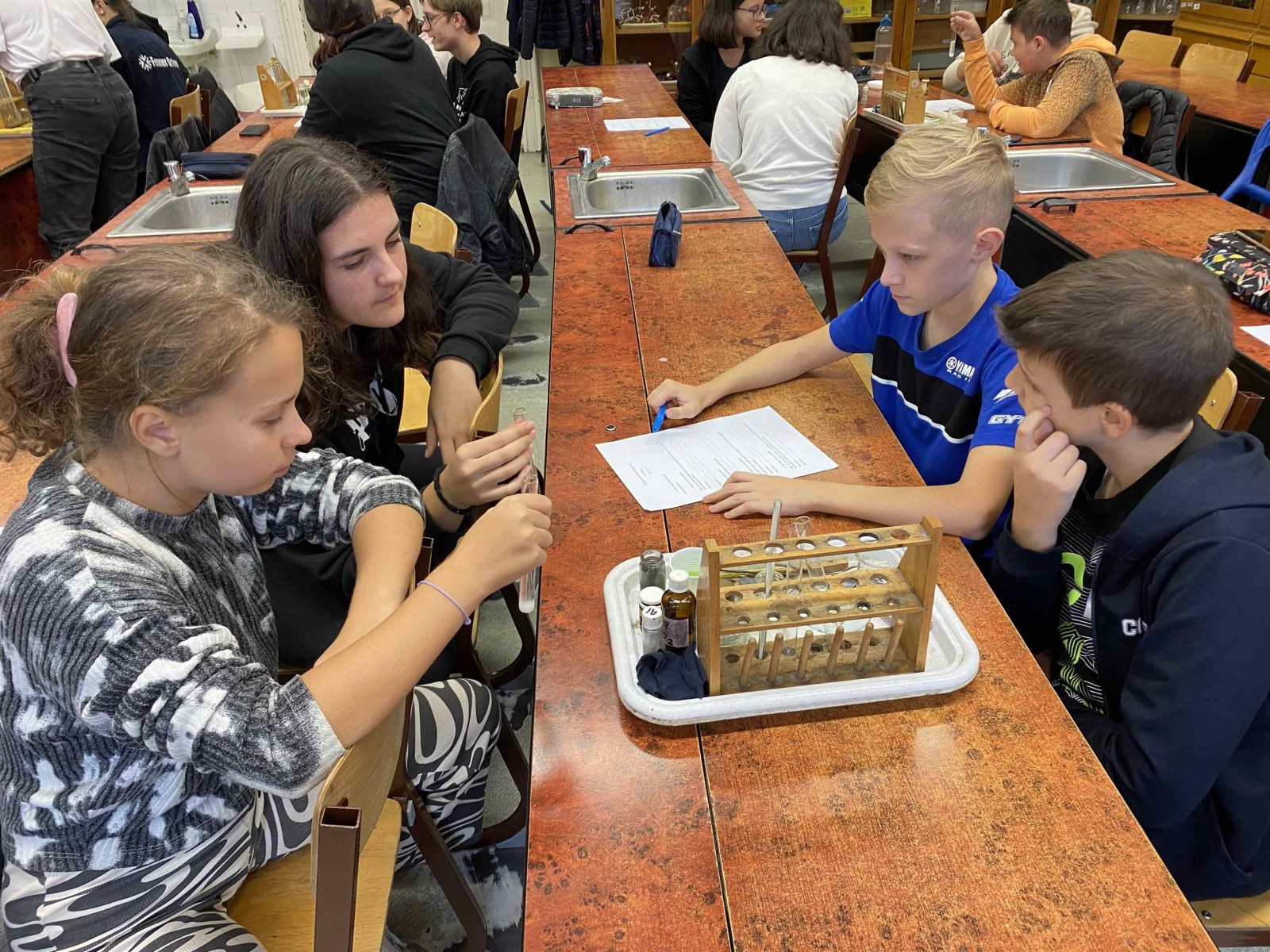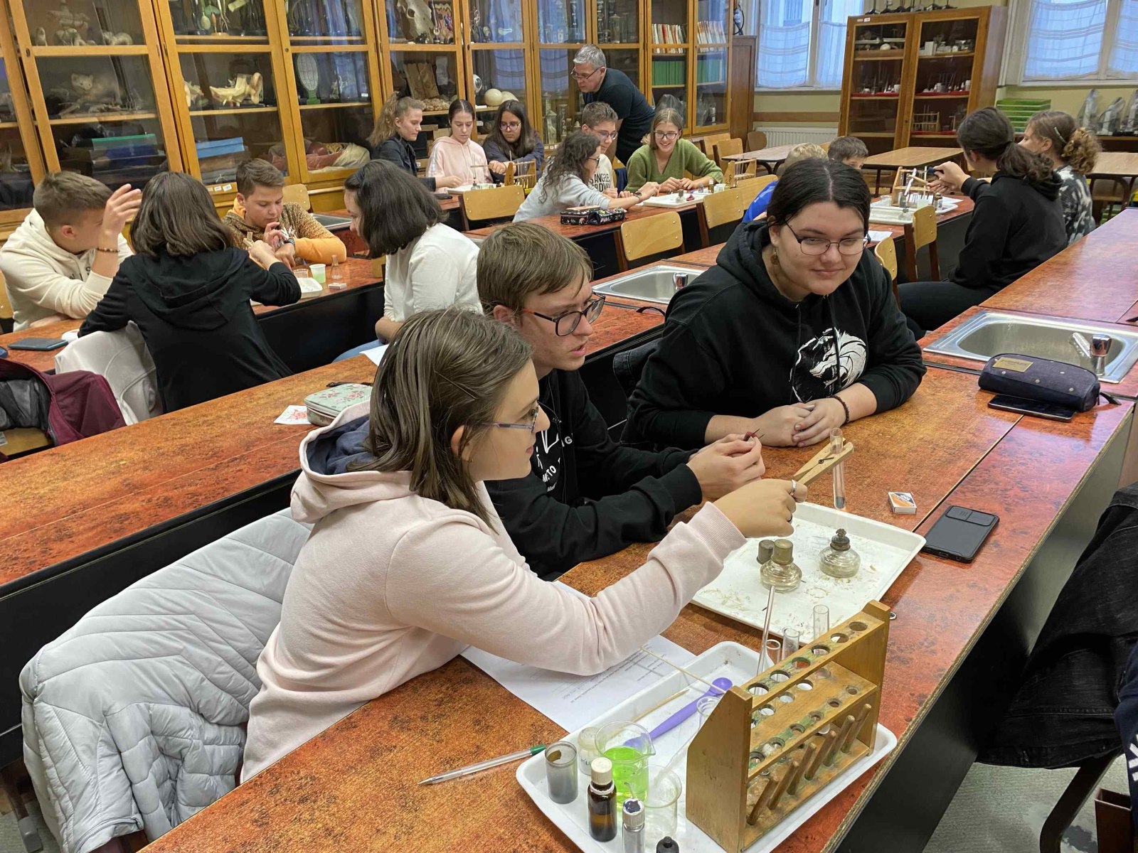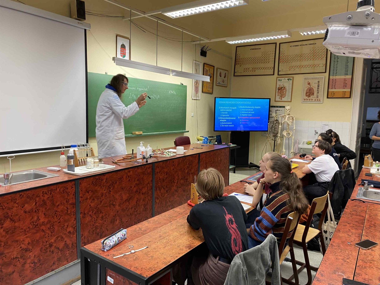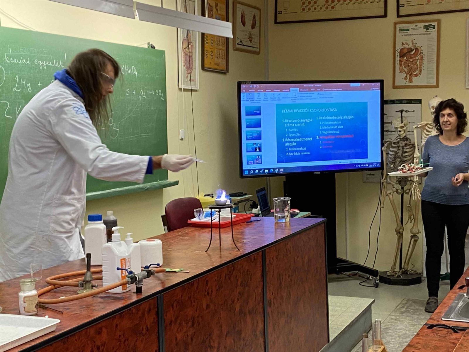 Ez a foglalkozás a kísérletezésről szólt. A diákok csoportokban dolgozva ismerték meg az exoterm és endoterm reakciókat. Kipróbálták a laboreszközöket, elsajátították a kémiai kísérletek elvégzésének helyes módszerét. A foglalkozáson egy régi tanítványunk, egykori műhelytag, is részt vett. Katona Gergő jelenleg Bécsben tanul, vegyész szakos hallgató. Mesélt az egyetemről, tárgyairól, a nehézségekről és a beszélgetés végén néhány kísérletet is bemutatott a hallgatóságnak. Reméljük néhány tanulónkat sikerült megnyernie a kémiának!