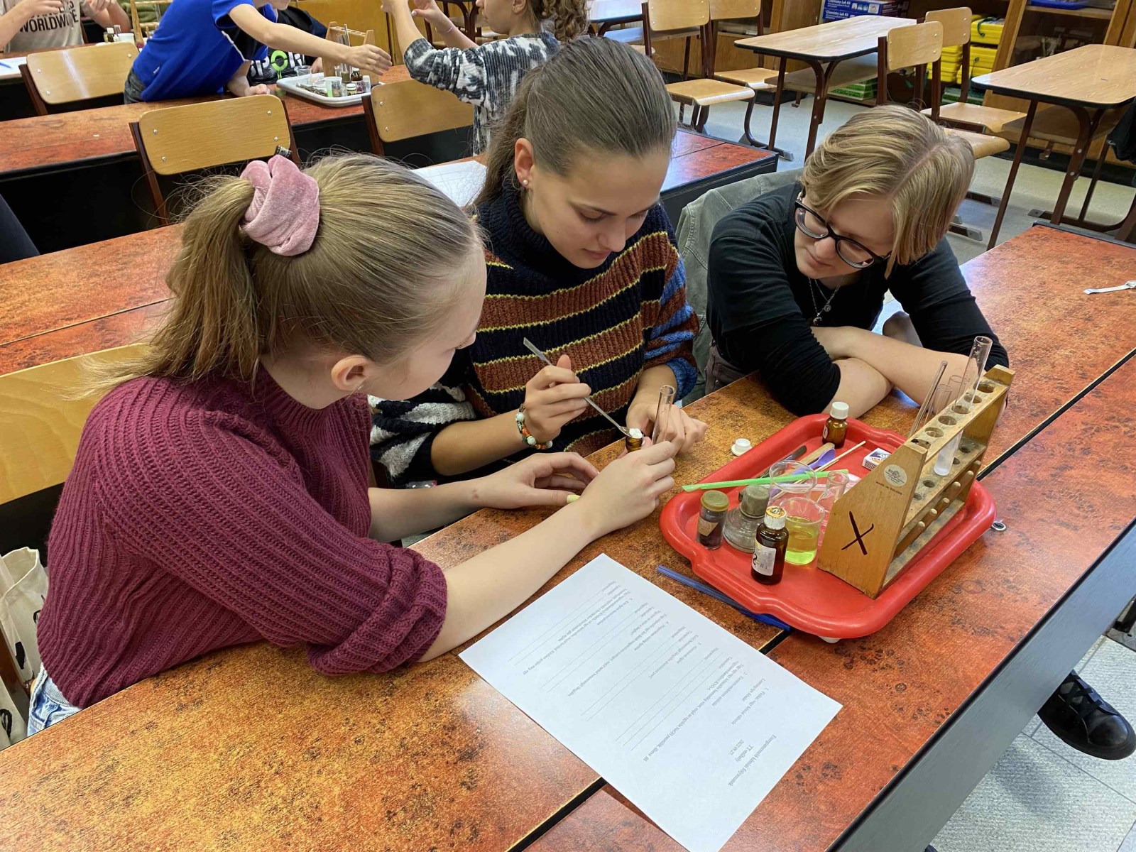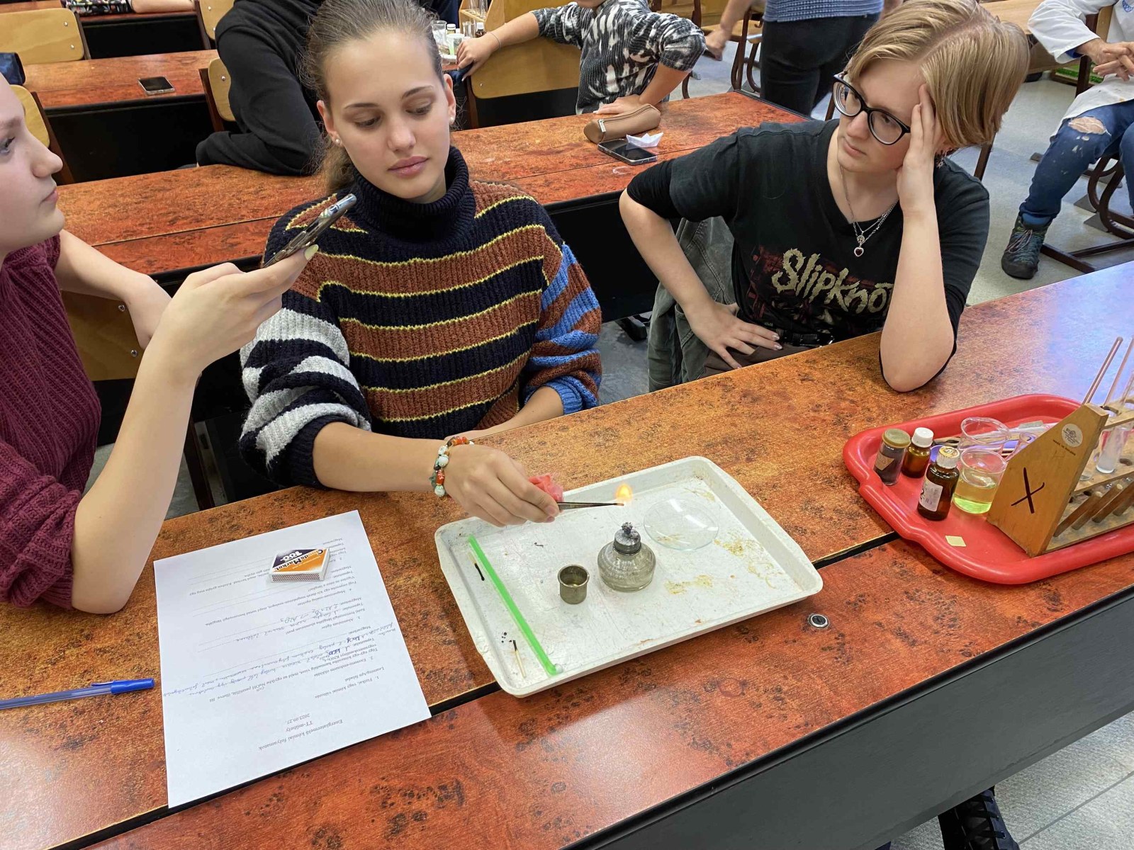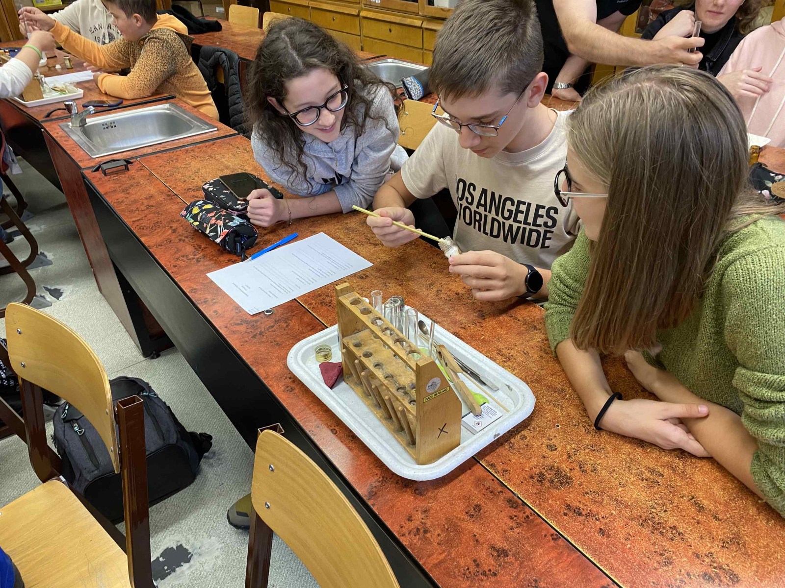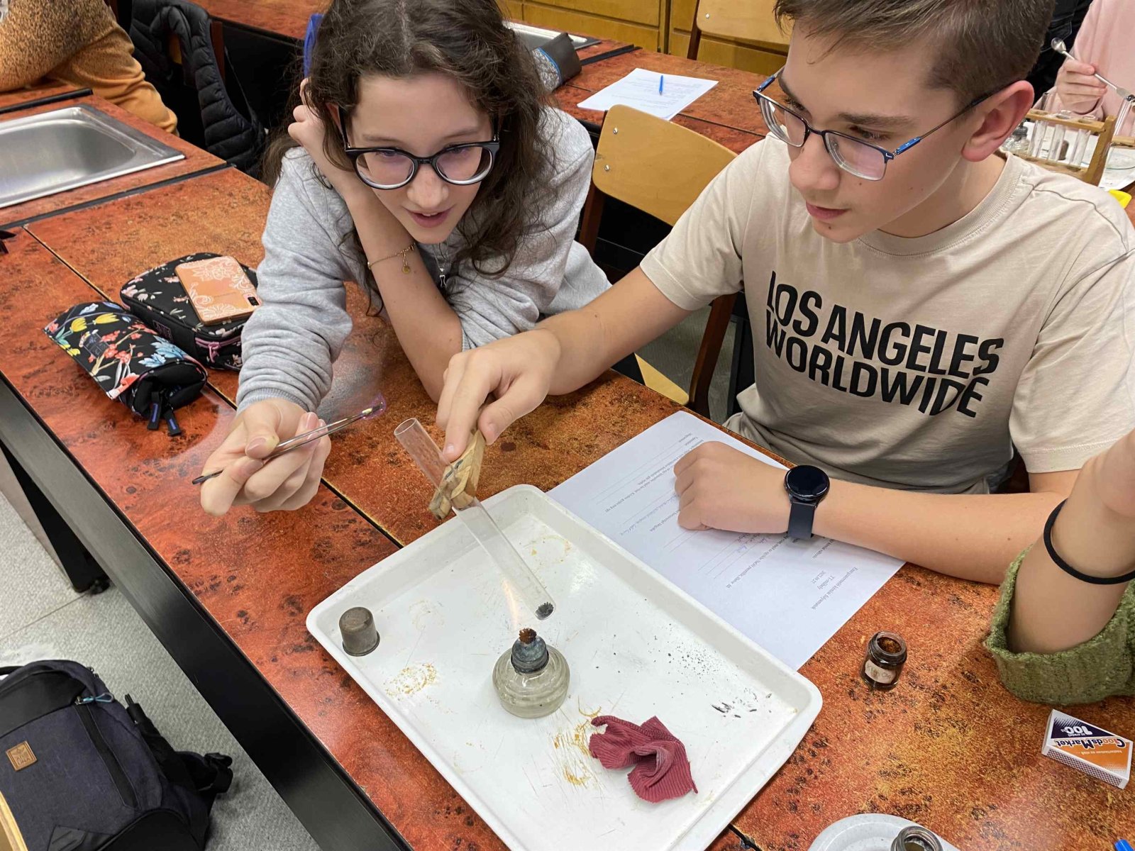 Ez a foglalkozás a kísérletezésről szólt. A diákok csoportokban dolgozva ismerték meg az exoterm és endoterm reakciókat. Kipróbálták a laboreszközöket, elsajátították a kémiai kísérletek elvégzésének helyes módszerét. A foglalkozáson egy régi tanítványunk, egykori műhelytag, is részt vett. Katona Gergő jelenleg Bécsben tanul, vegyész szakos hallgató. Mesélt az egyetemről, tárgyairól, a nehézségekről és a beszélgetés végén néhány kísérletet is bemutatott a hallgatóságnak. Reméljük néhány tanulónkat sikerült megnyernie a kémiának!